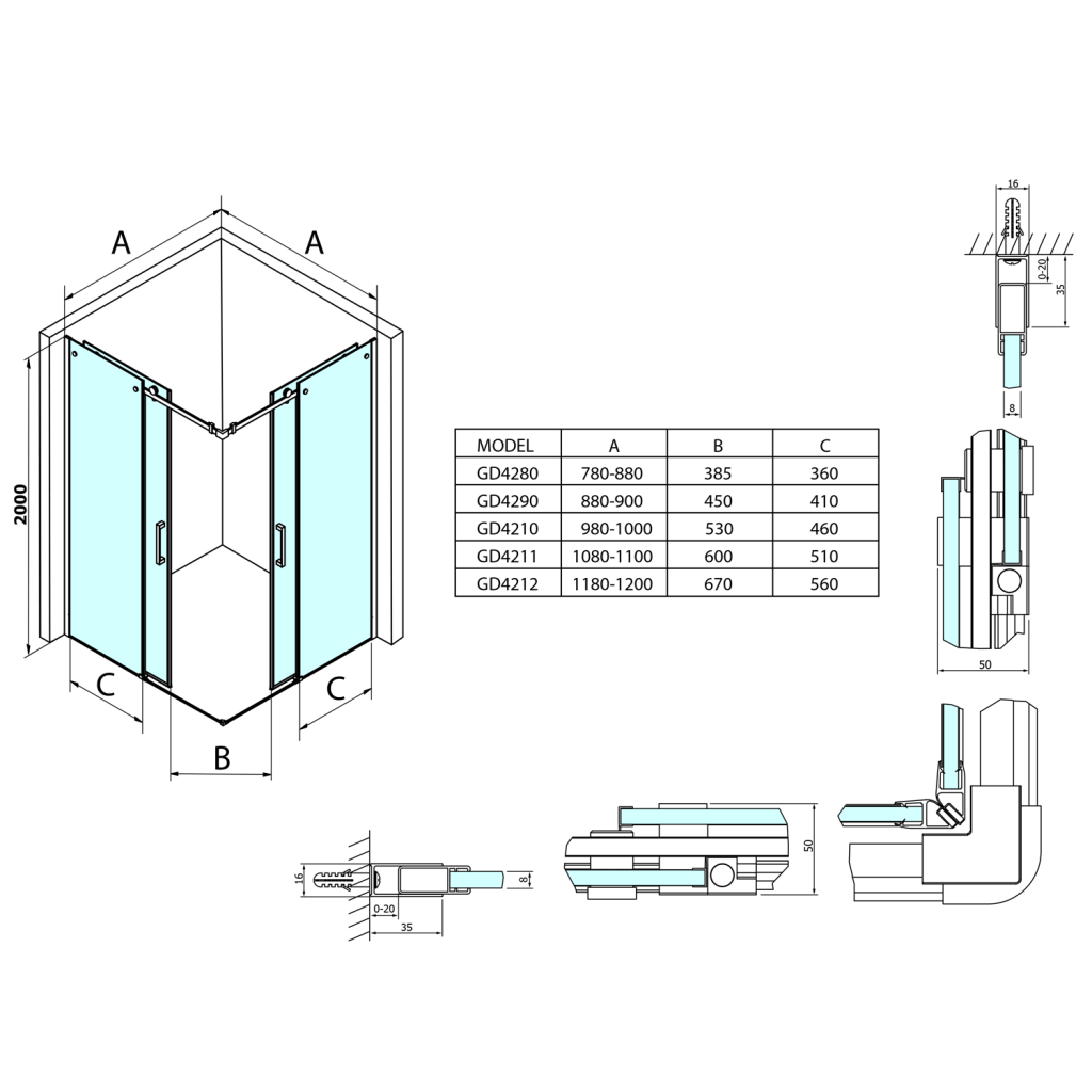 - Přístěnné profily jsou nastavitelné až o 15 mm a řeší tak nerovnosti stěn