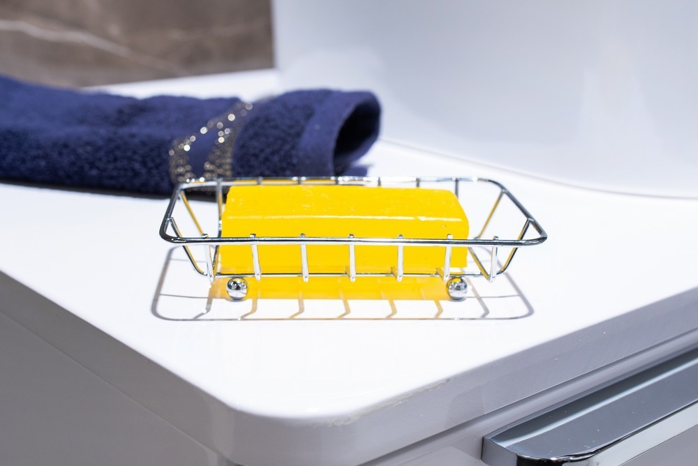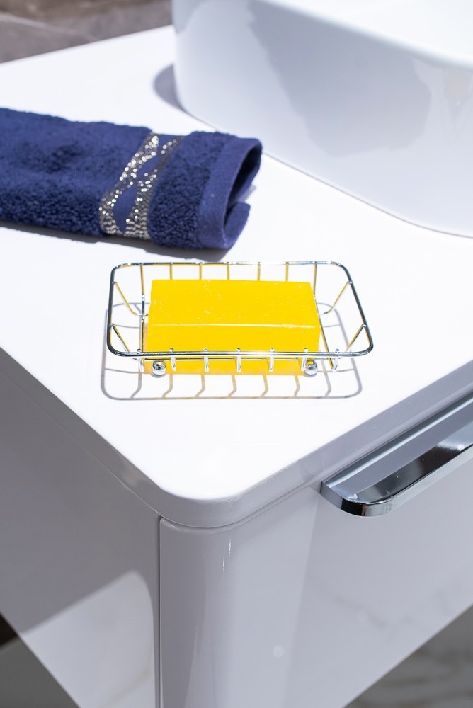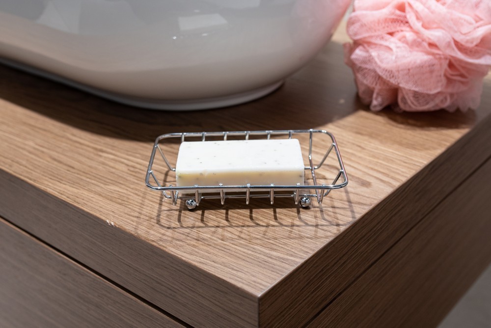 Obdélníková miska na mýdlo z chromovaného drátu. Nohy jsou chráněny plastem.