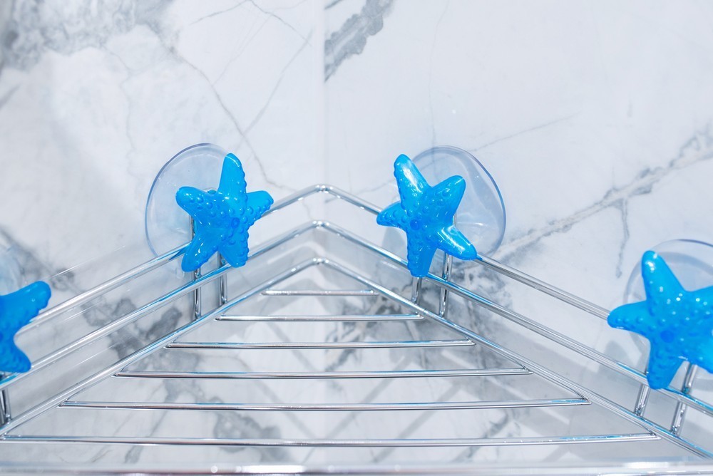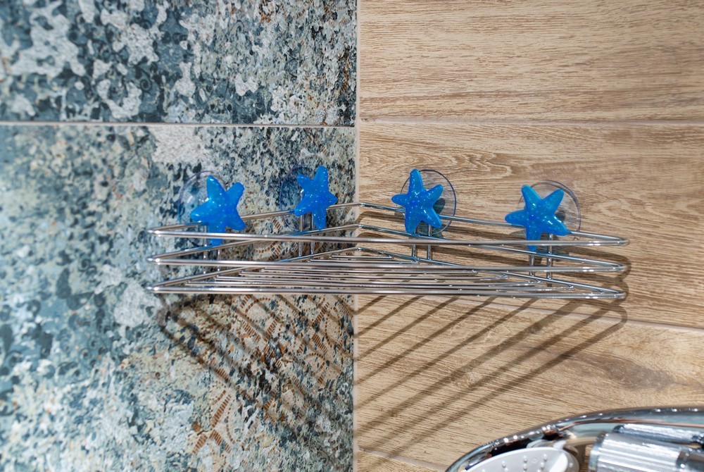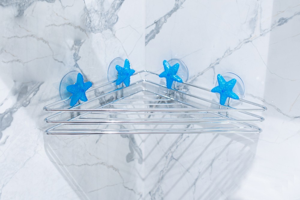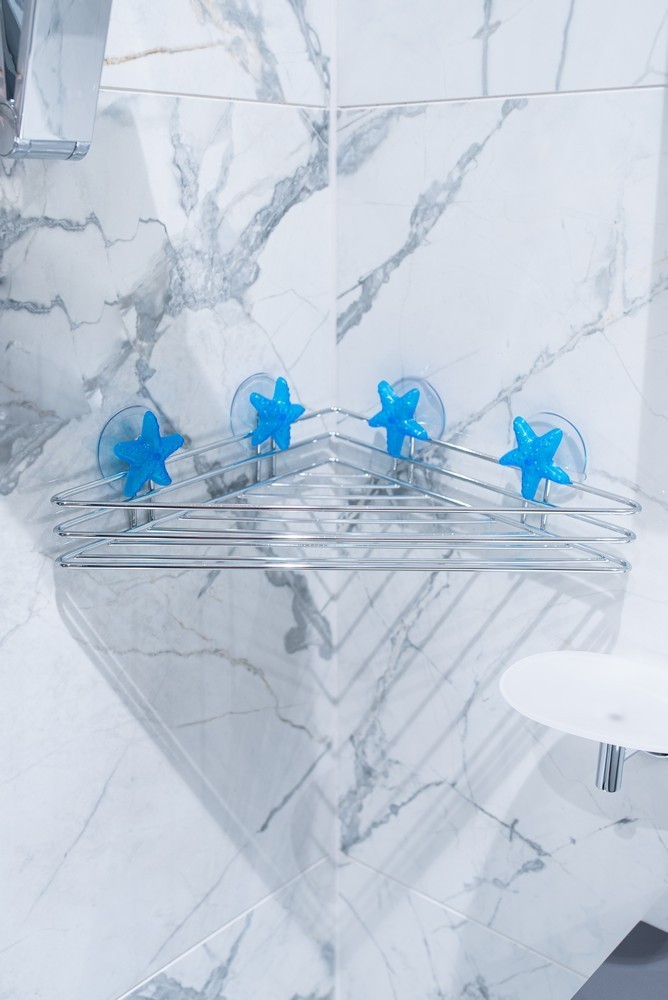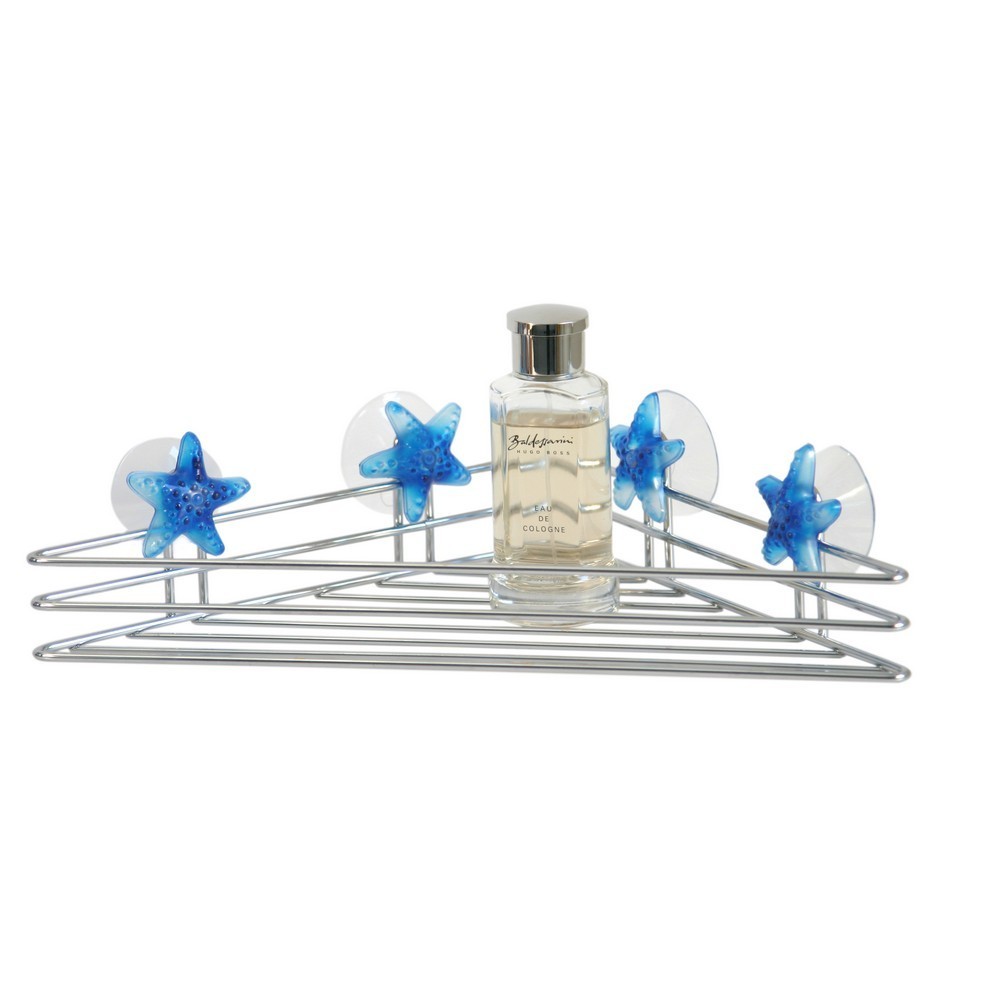 Úhlová police upevněná na přísavkách, vyrobena z chromovaného drátu.