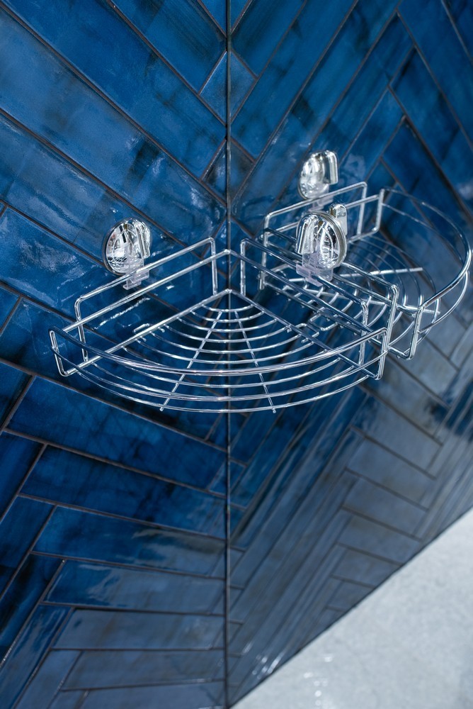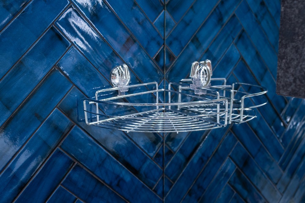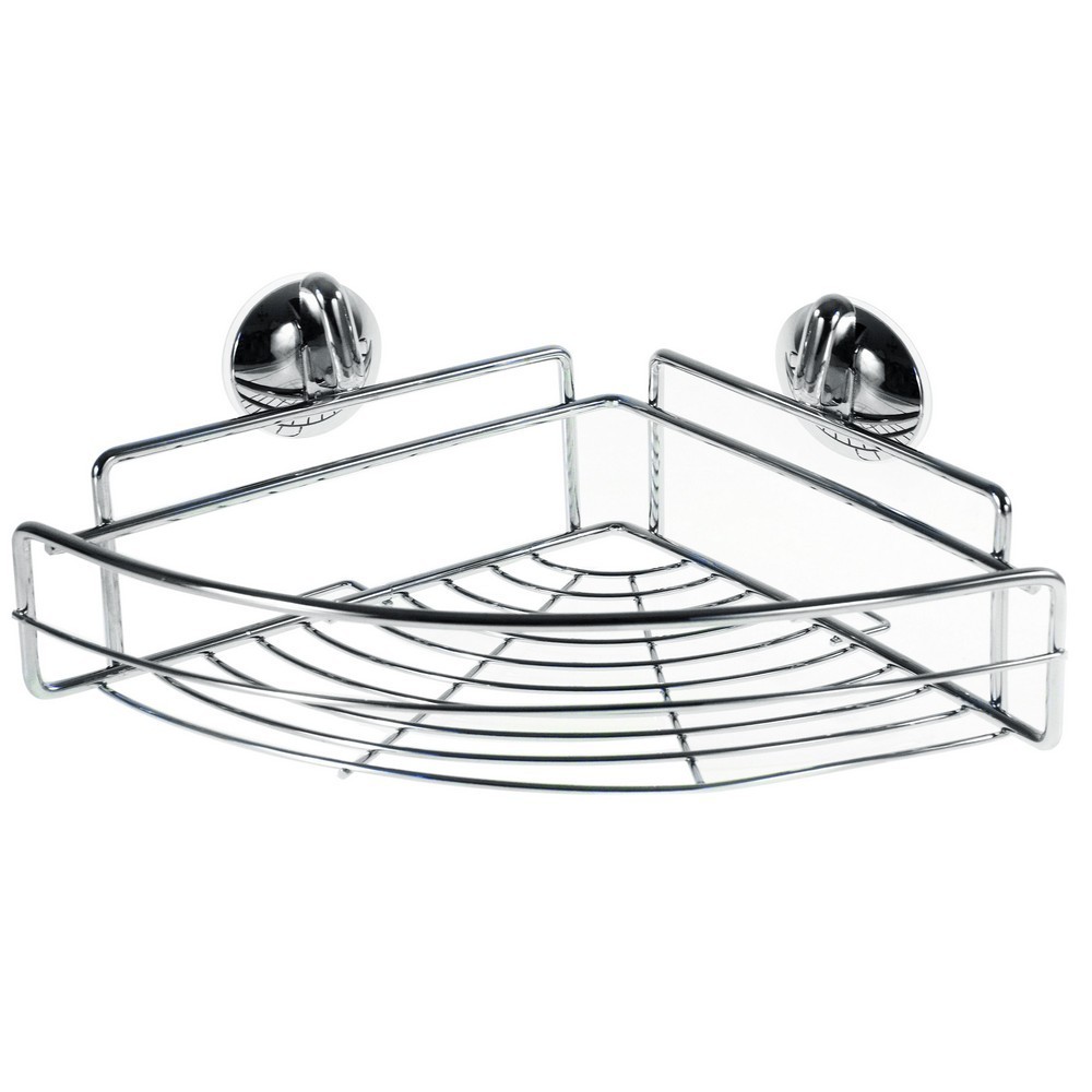 Rohová police z chromované oceli, upevněná na přísavkách.