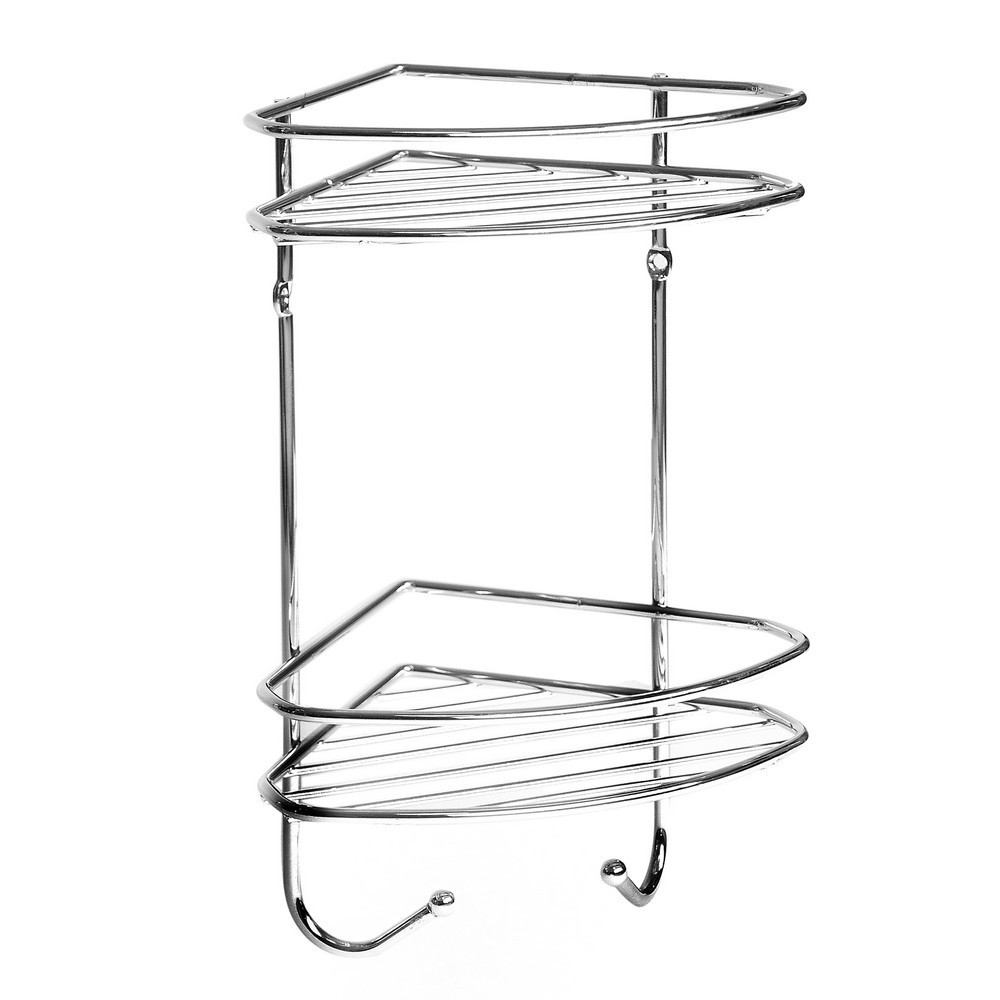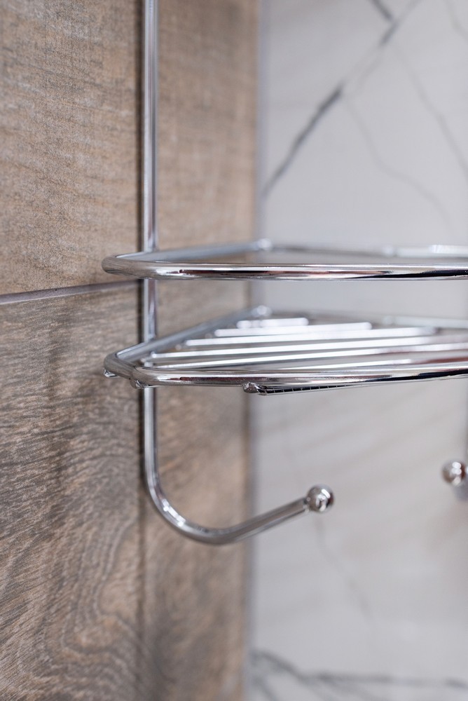 Rohová, dvouúrovňová police z chromovaného drátu. Koupelnová polička má ve spodní části také dva praktické háčky na zavěšení. Šrouby a hmoždinky pro montáž jsou součástí sady.
