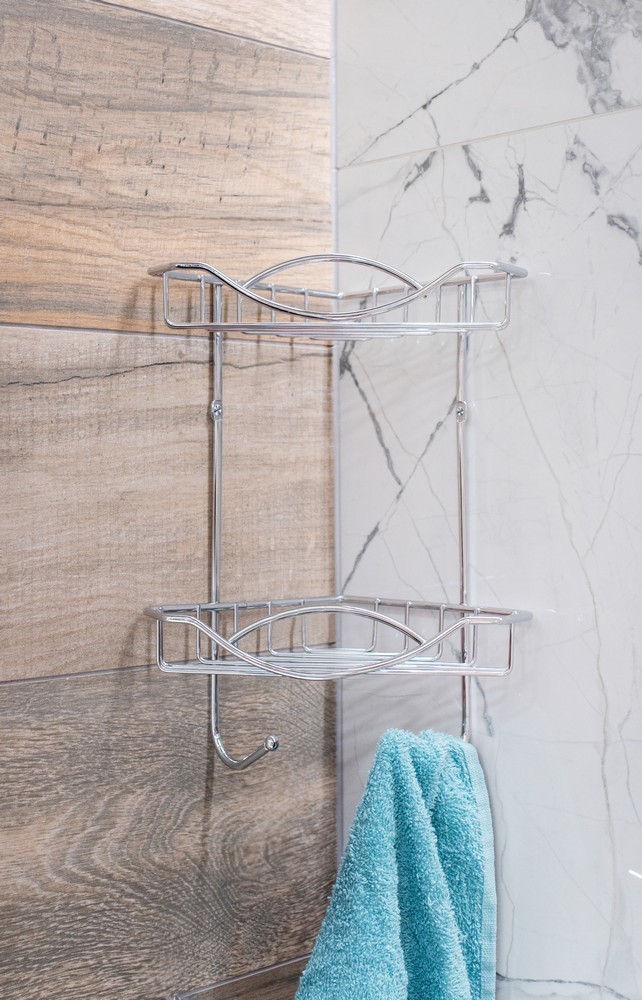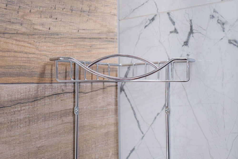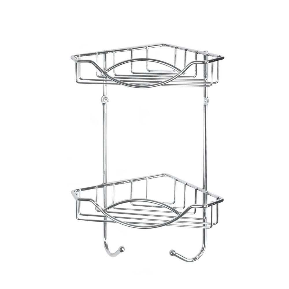 Dvojitá koupelnová polička se 2 dalšími háčky ve spodní části. Je vyrobena z chromované oceli. Šrouby a hmoždinky pro montáž jsou součástí sady.