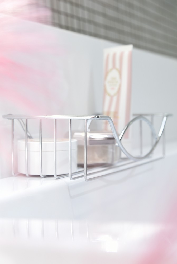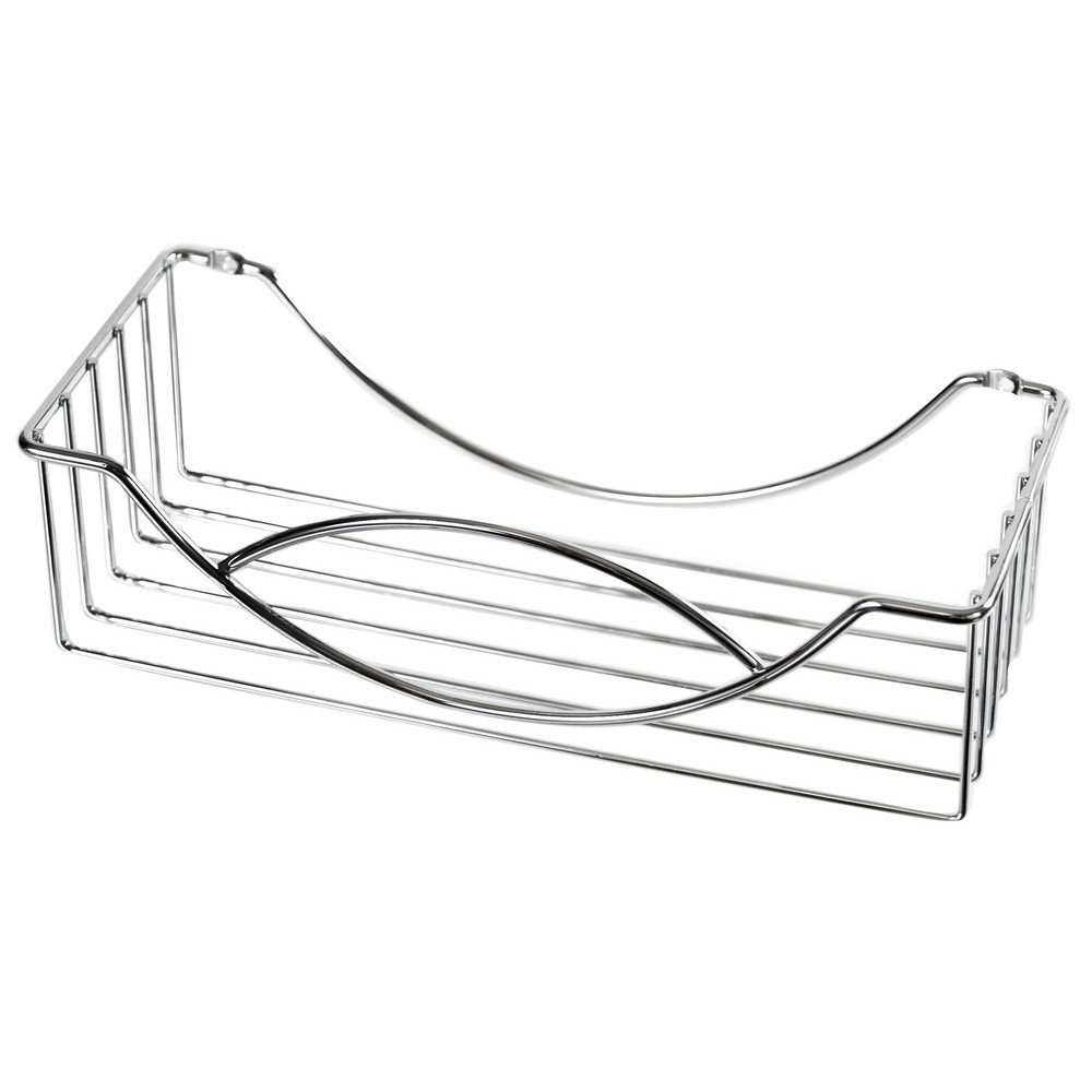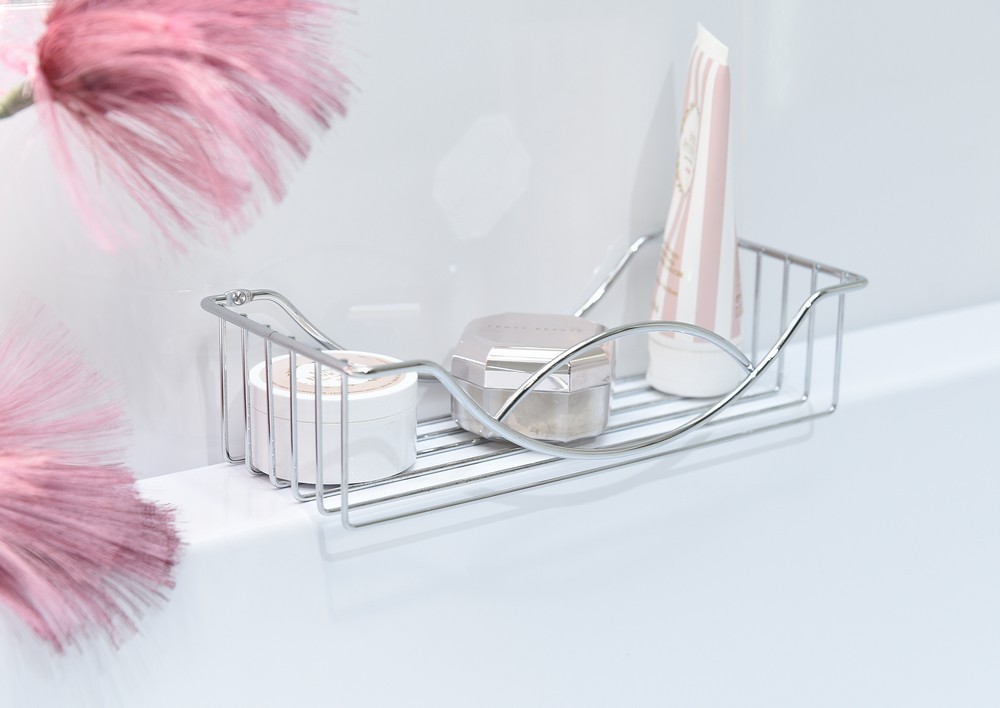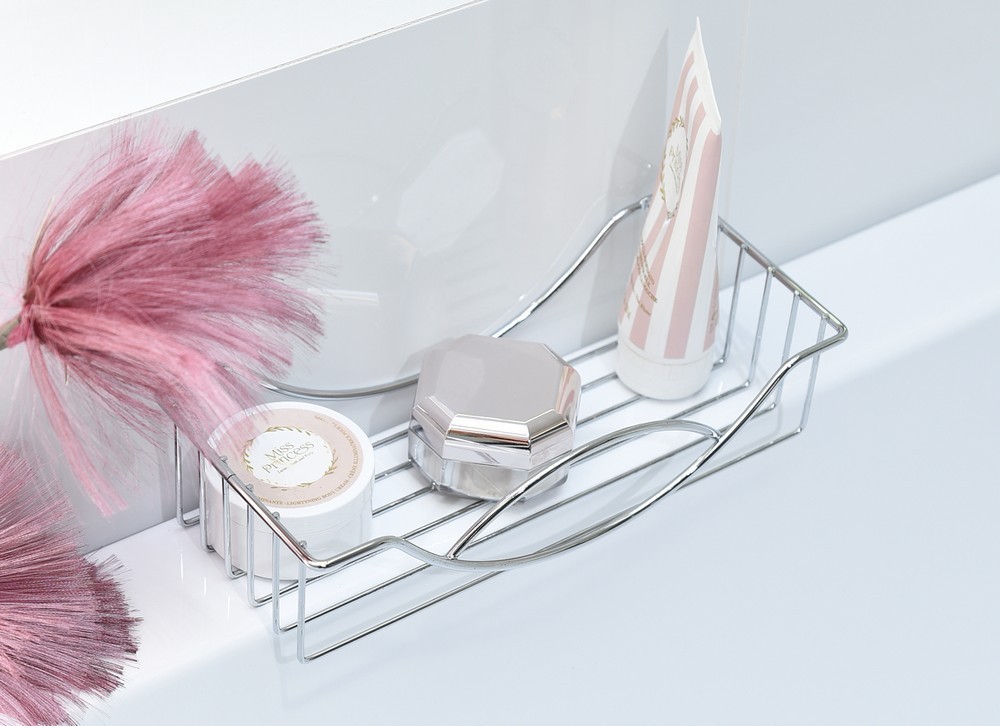 Koupelnová police z chromovaného kovu. Montáž se provádí pomocí šroubů a hmoždinek, které jsou součástí sady.