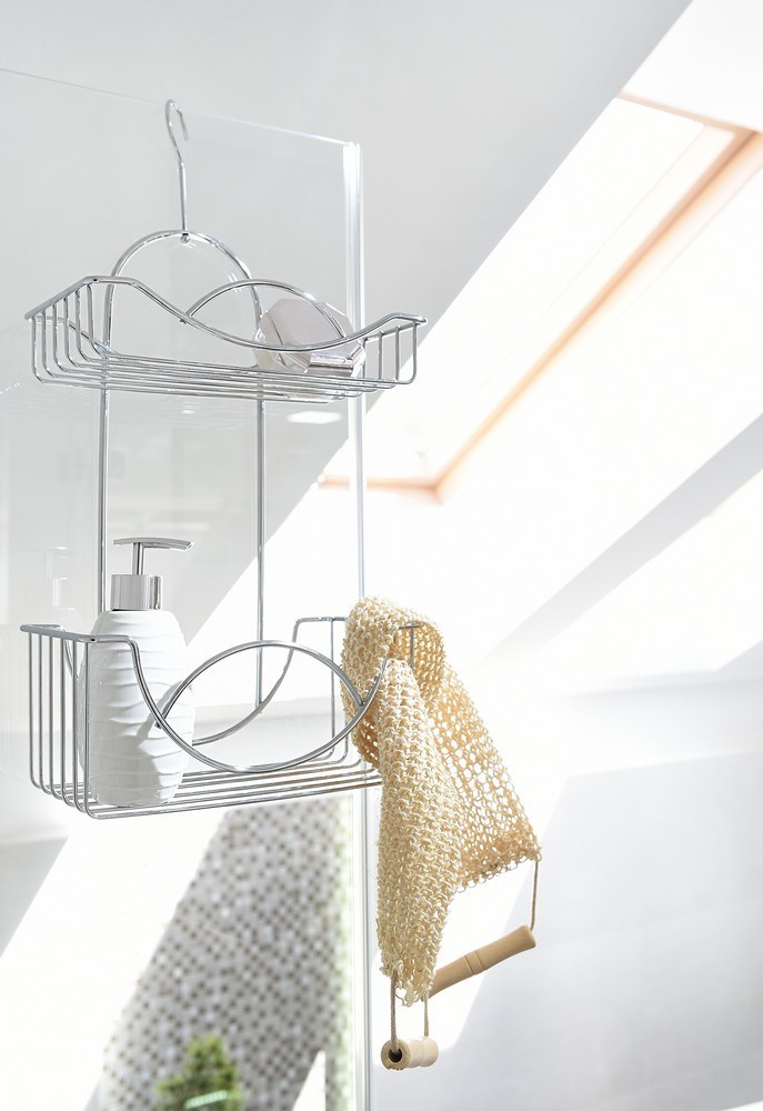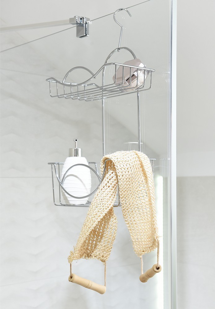 Koupelnová polička zavěšená na háčku, vyrobená z pochromovaného kovu.