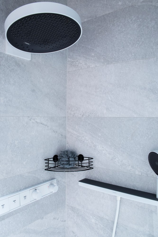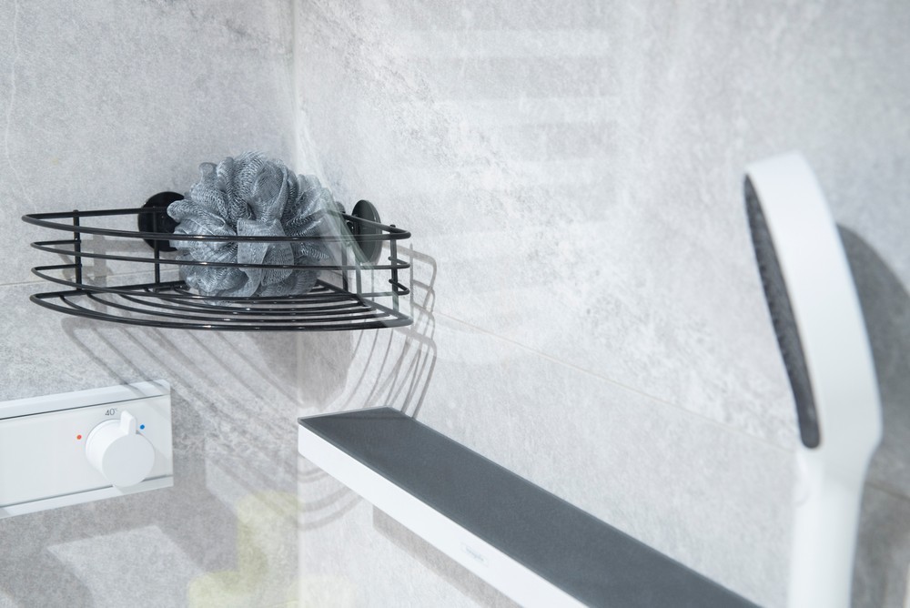 Koupelnová nebo sprchová polička vyrobená z lesklé černé lakované oceli. Instalace koupelnové police nevyžaduje vrtání, namontovaná na 3M pásce s vysokou přilnavostí. Rohová koupelnová polička umožňuje ušetřit místo montáží do rohu.