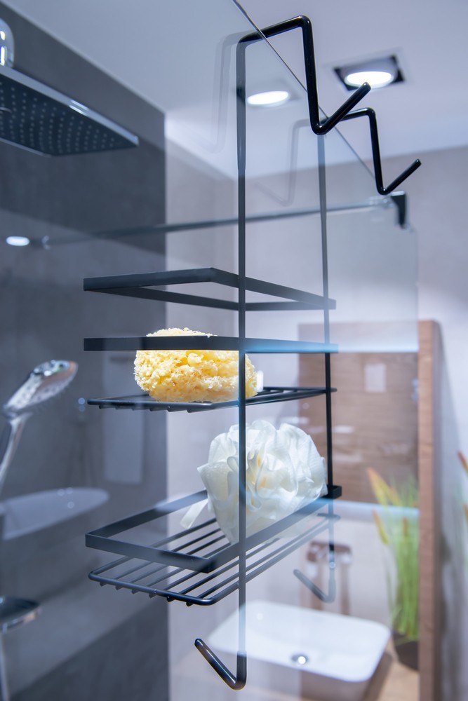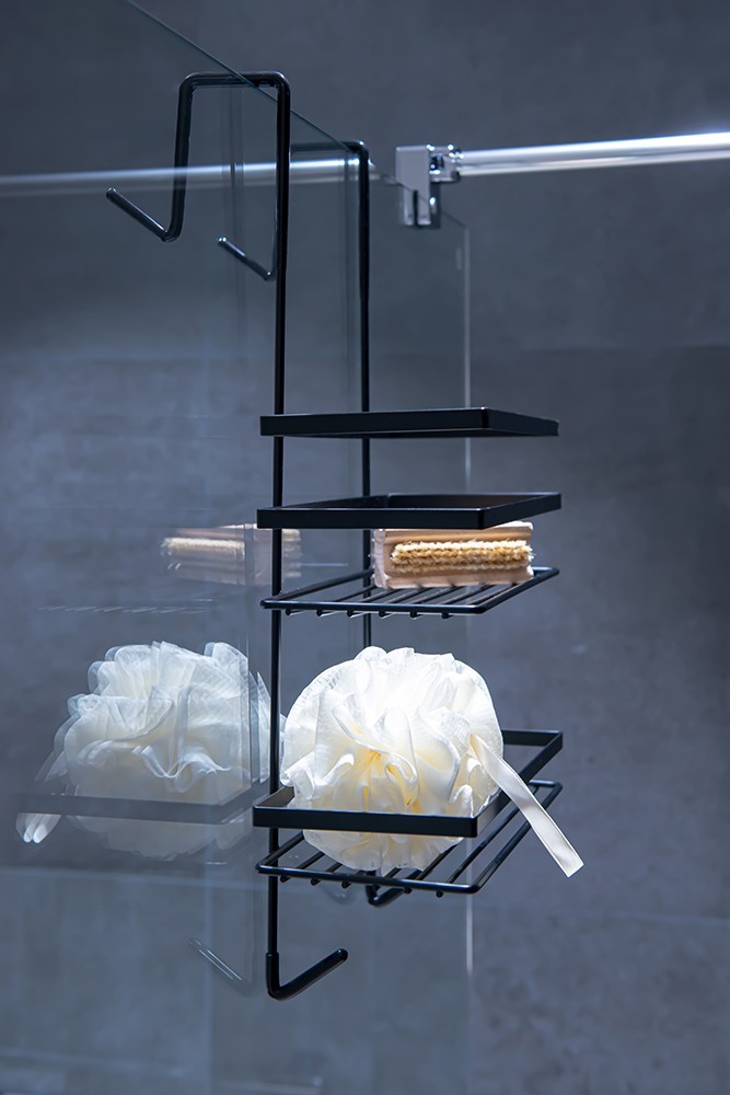 Koupelnová polička je vyrobena z černého lakovaného kovu s matnou povrchovou úpravou. Má dva koše na koupelnové doplňky. Horní a spodní háčky jsou chráněny silikonovými krytkami.