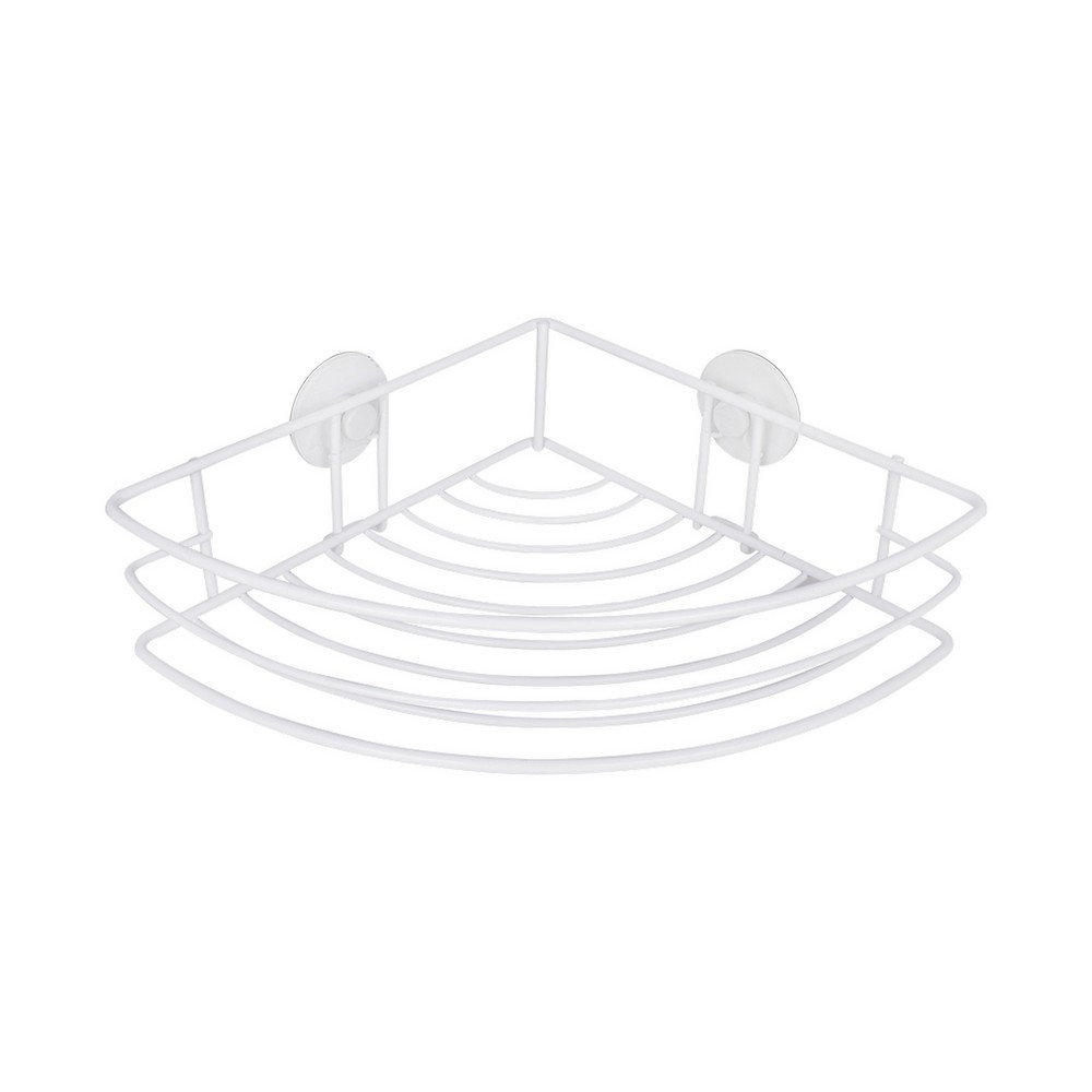 Rohová drátěná police z bíle lakované oceli. Připevněno 3M samolepicí páskou. Jeho maximální nosnost je 4 kg.