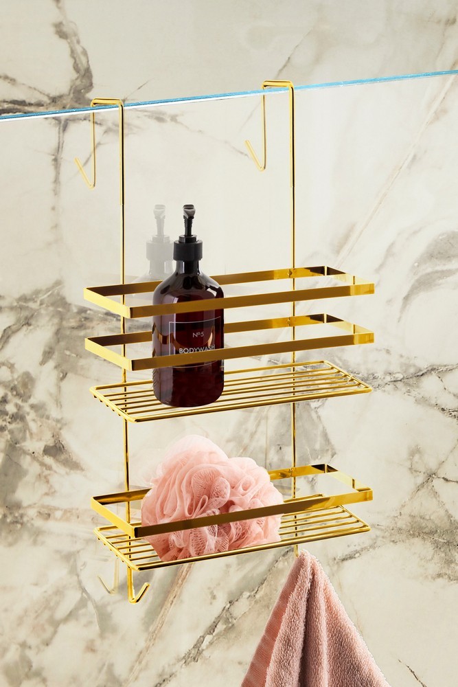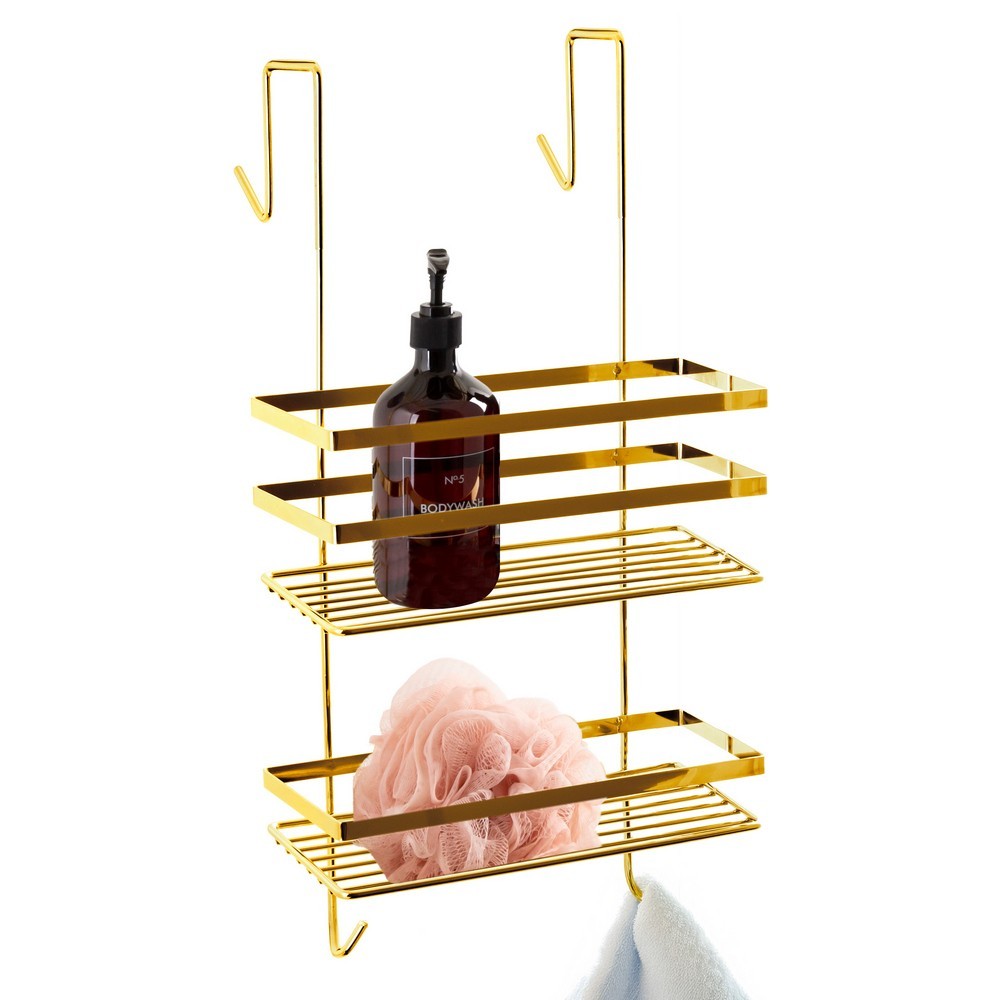 Popis: Stylová sprchová polička AWD INTERIOR ve zlaté barvě je perfektním řešením do koupelen, kde záleží na praktičnosti i designu. Je vyrobena z oceli potažené zlatem a nabízí dvě prostorné police na toaletní potřeby a další háčky – dvě na štětce nebo houby a dvě na ručníky. Díky měkce potaženým věšákům chrání polička hrany sprchové kabiny nebo vanové zástěny před poškrábáním. Tento elegantní a trendy doplněk je dokonalým doplňkem každé koupelny a dodává jí třídu a pohodlí.