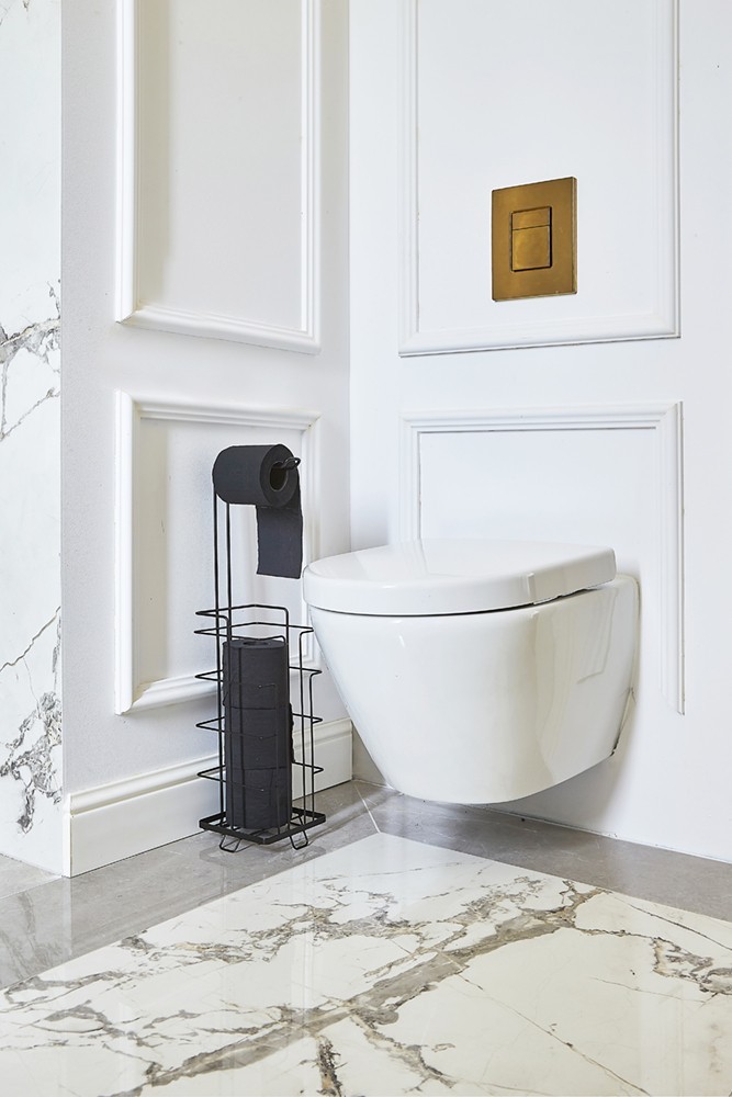 Popis: Stylový a funkční držák toaletního papíru AWD INTERIOR 1979, kombinující minimalistický design s praktickým řešením úložného prostoru. Vyrobeno z vysoce kvalitní oceli, práškově lakované v elegantním matném černém provedení, má drátěnou konstrukci, která dodává každému interiéru nádech lehkosti a modernosti. Výrobek je navržen s ohledem na pohodlí a úsporu místa. Součástí je držák na aktuálně používanou roli toaletního papíru a praktický košík, do kterého lze uložit až tři náhradní role. To zajišťuje organizaci a snadný přístup k toaletnímu papíru za všech okolností. Jeho minimalistický tvar a univerzální design z něj dělají perfektní doplněk do koupelen v loftovém, industriálním nebo moderním stylu. Kompaktní velikost umožňuje umístění i v malých prostorech, zatímco robustní konstrukce zajišťuje stabilitu a eliminuje riziko viklání.