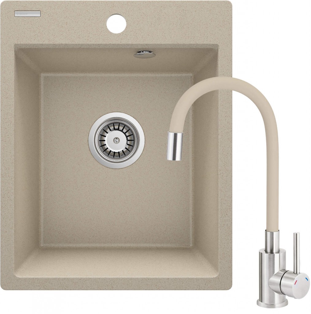 Granitový dřez s baterií tvoří kompletní sestavu do kuchyně. Je vyrobena z odolné přírodní žuly, která odolává nejen vysokým teplotám a jejich kolísání, ale i nárazům a zabarvení, v souladu s evropskou normou PN-EN 13310. Navíc je obohacena o hydrofobní vrstvu, usnadňující tok jednotlivých kapek. Ve stejných barvách nechybí ani vodovodní baterie s pohodlným výtokem. Praktický dřez malé velikosti s jednou mísou je perfektním řešením pro malé kuchyně a studiové apartmány s kuchyňským koutem.
