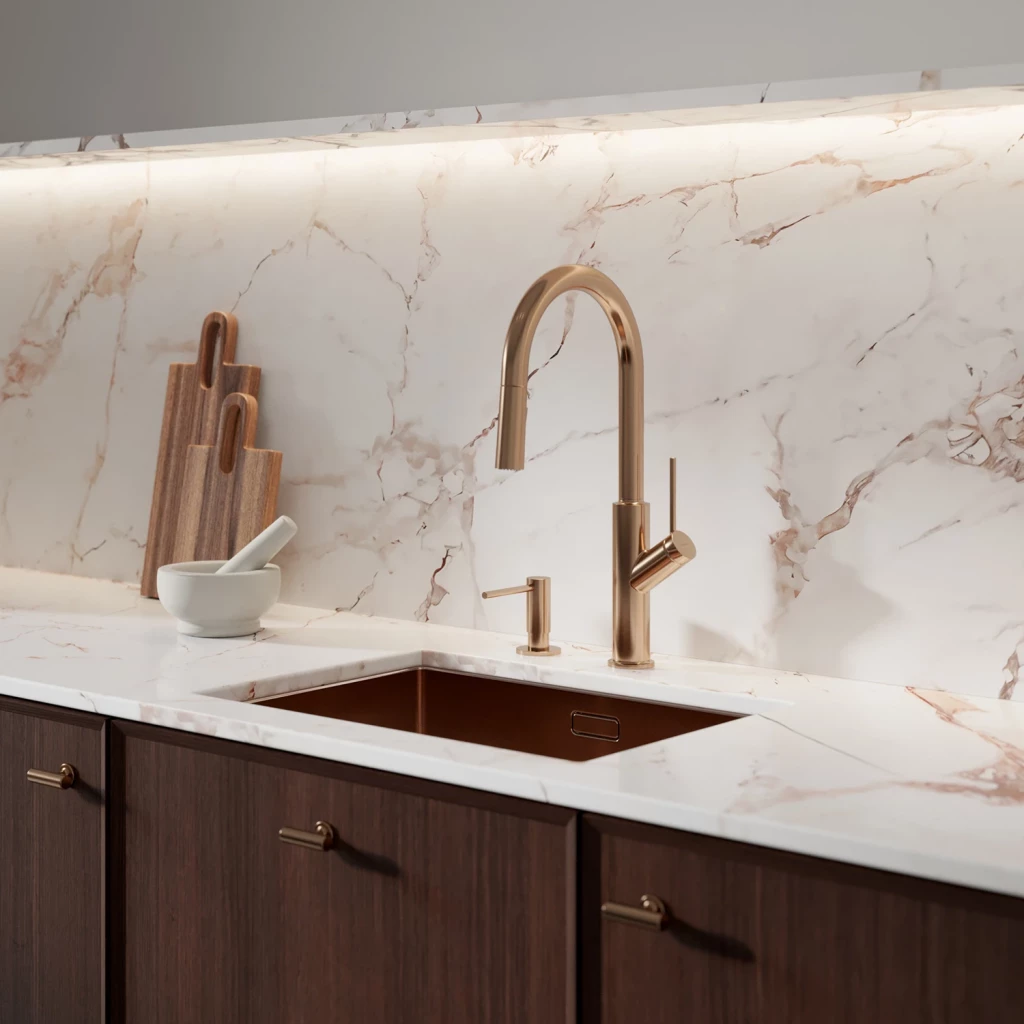 Baterie o výšce 44,9 cm je vybavena otočným výsuvným výtokem s 2funkční sprchou, která zvyšuje dosah proudu vody a komfort používání. Baterie je vyrobena z kvalitní mosazi a opatřena nejkvalitnější keramickou kartuší. Inovativní technologická řešení zajišťují nejvyšší komfort používání a snižují spotřebu vody na polovinu.