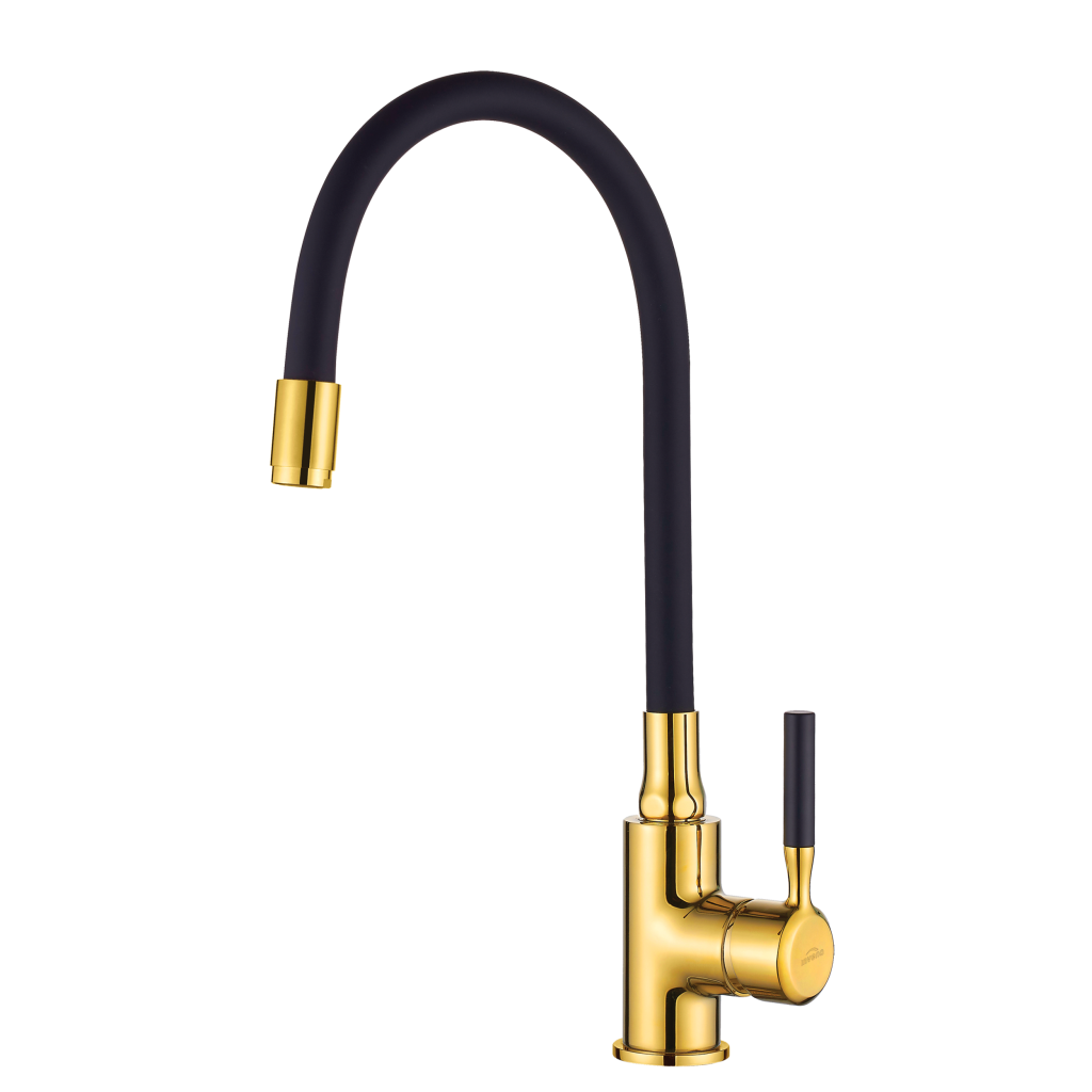Má flexibilní výtok s tvarovou pamětí, který usnadní mytí nádobí různých velikostí. Část rukojeti baterie je potažena černým silikonem v barvě výlevky, díky čemuž zlatá nepřebíjí celek, ale vytváří subtilní celek.