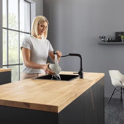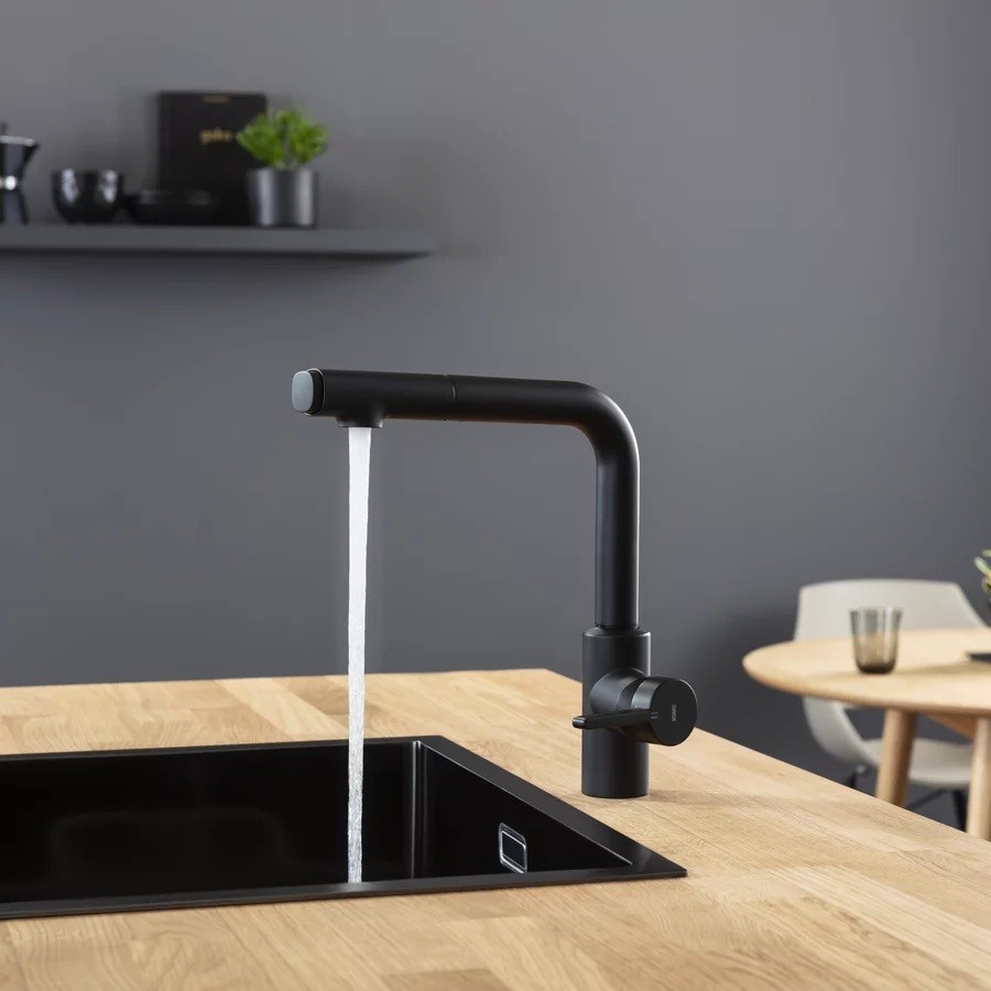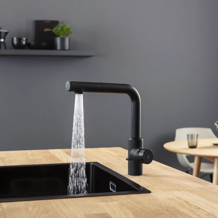 Dřezová páková baterie s výsuvnou koncovkou a přepínáním síly proudu, Matt Black, materiál mosaz, kartuše s keramickým diskem