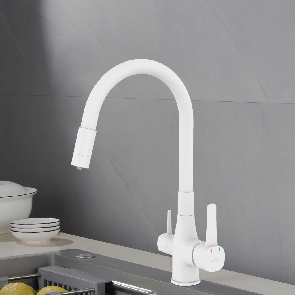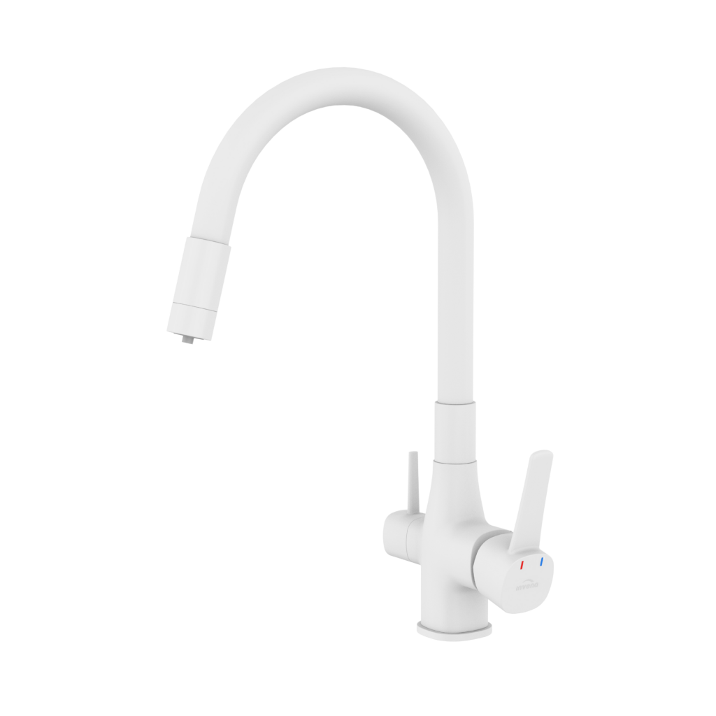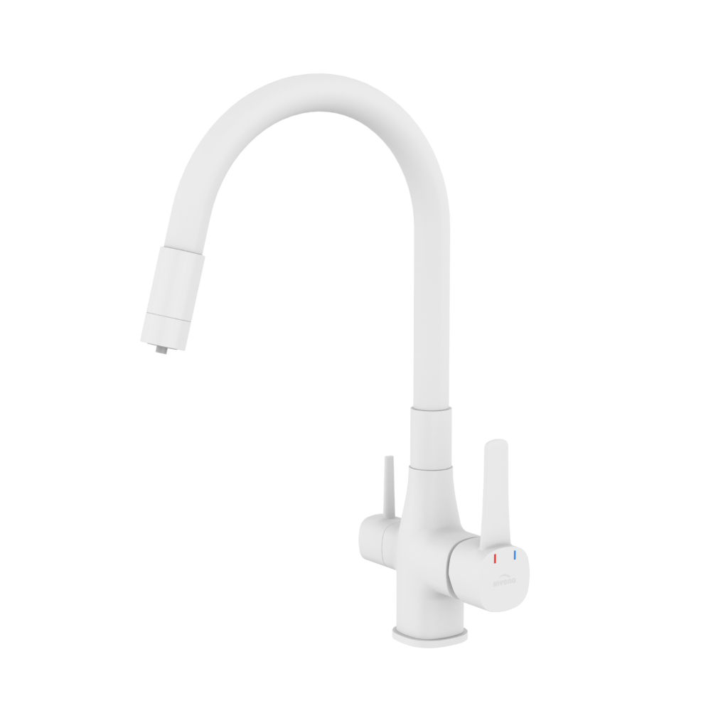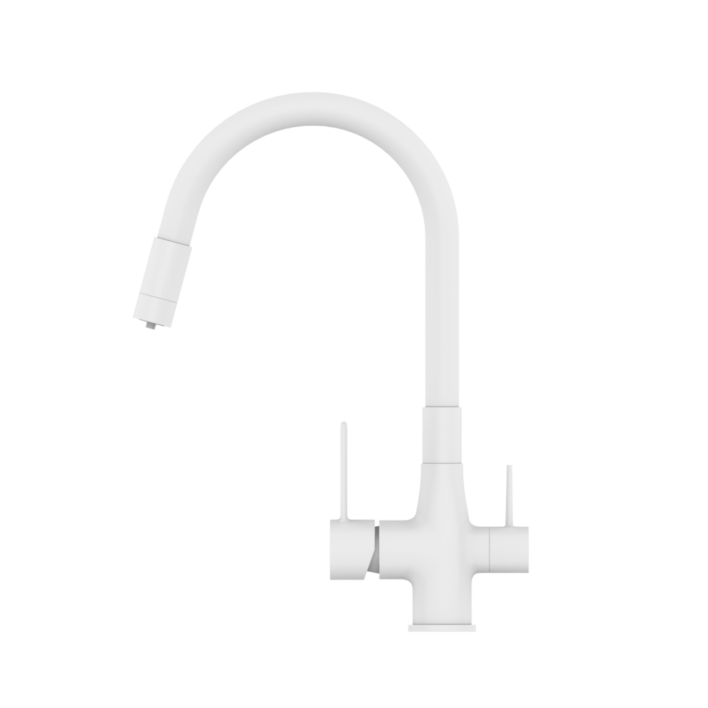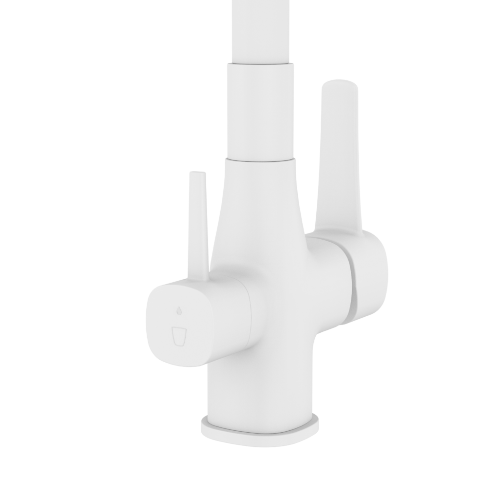 Baterie je vybavena dvěma samostatnými rukojeťmi – jedna na běžnou vodu, druhá na filtrovanou – což šetří filtr a zajišťuje maximální komfort při každodenním používání. Flexibilní výtok zvyšuje dosah a pohodlí při práci ve dřezu.