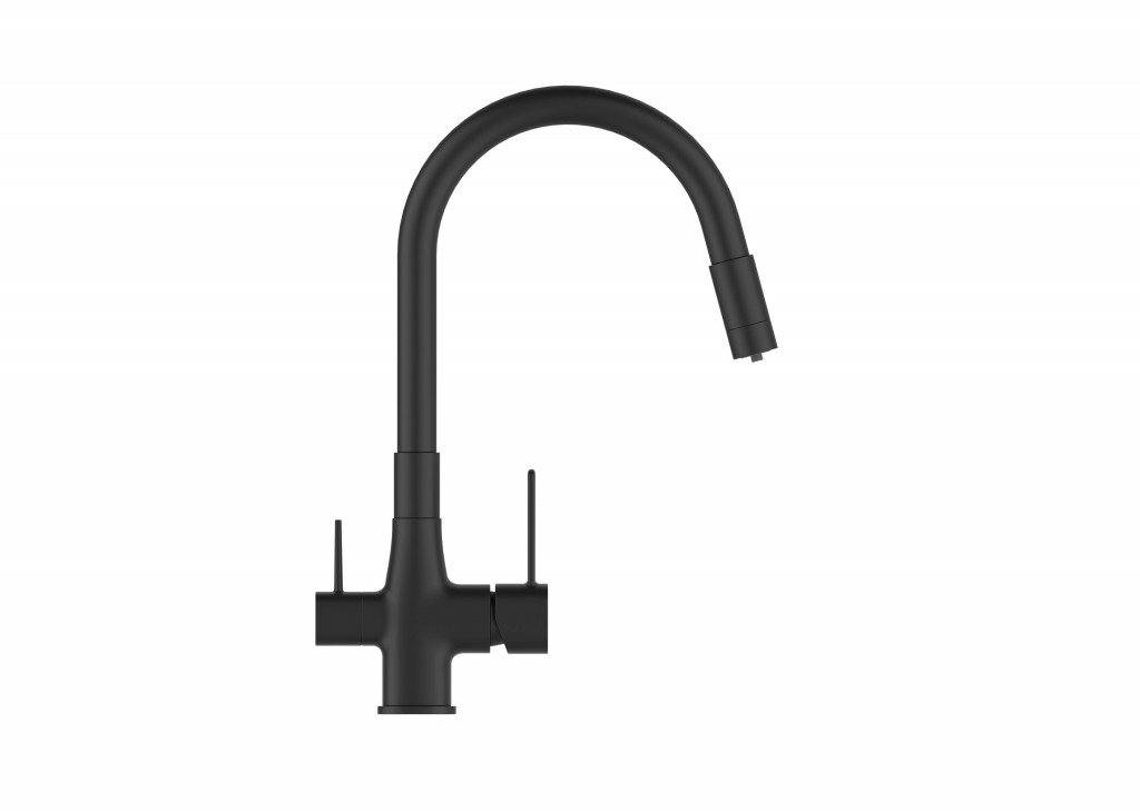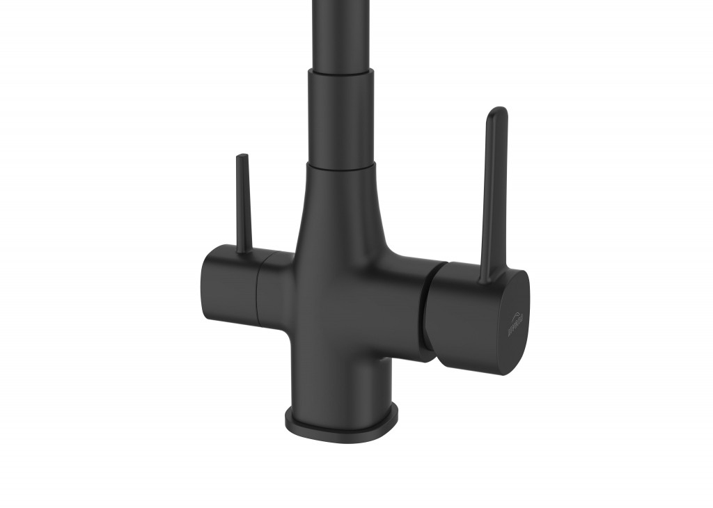 Baterie je vybavena dvěma samostatnými rukojeťmi – jedna na běžnou vodu, druhá na filtrovanou – což šetří filtr a zajišťuje maximální komfort při každodenním používání. Flexibilní výtok zvyšuje dosah a pohodlí při práci ve dřezu.