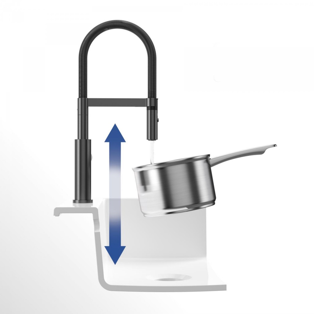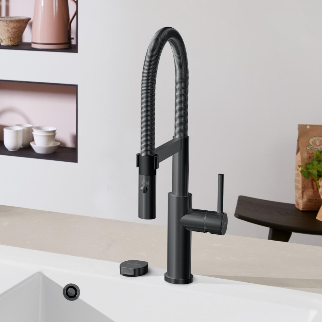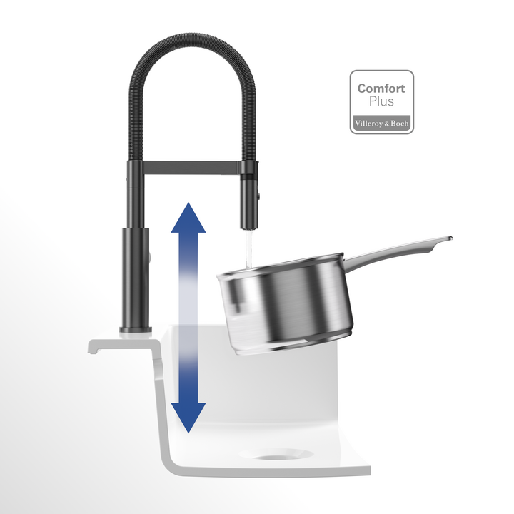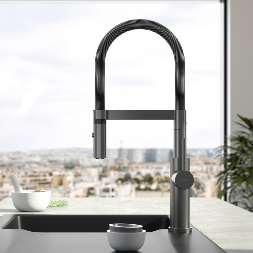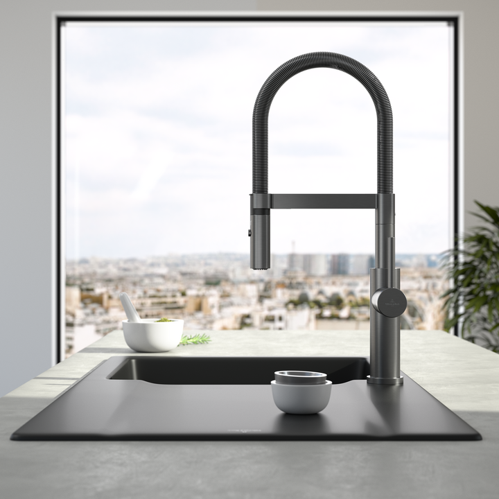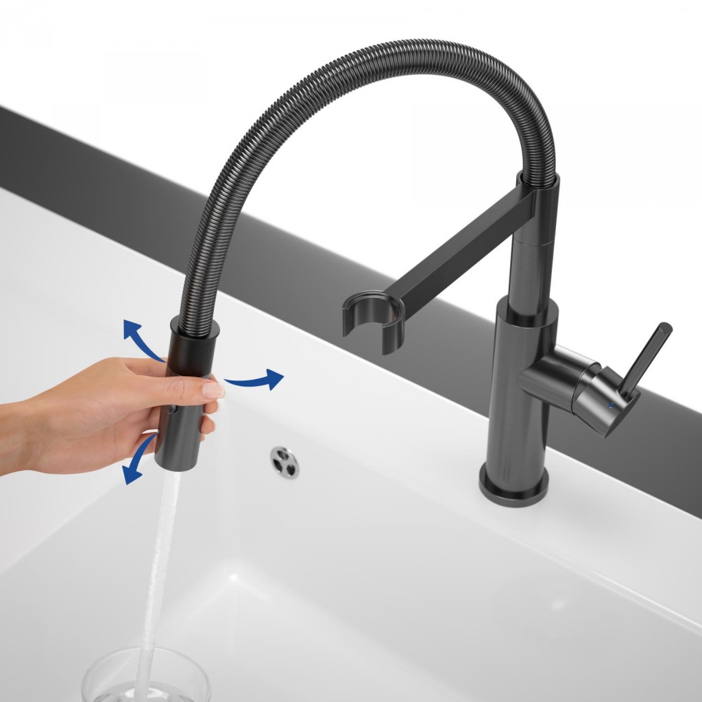 Dřezová páková baterie s flexibilním ramenem a odnímatelnou sprchou, antracit, materiál masivní nerez, kartuše s keramickým těsněním