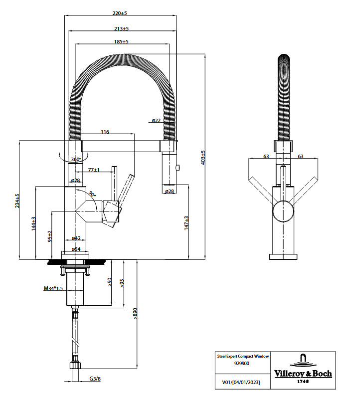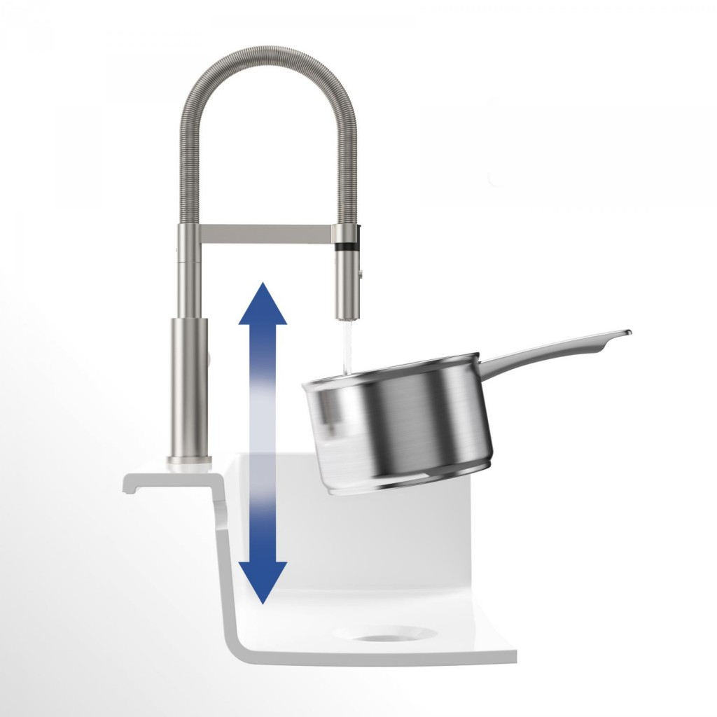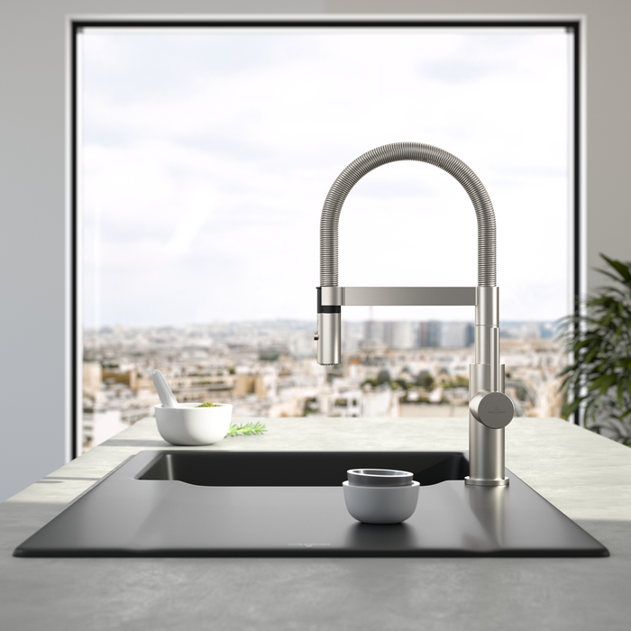 Podokenní dřezová páková baterie s flexibilním ramenem a odnímatelnou sprchou, nerez mat, materiál masivní nerez, kartuše s keramickým těsněním