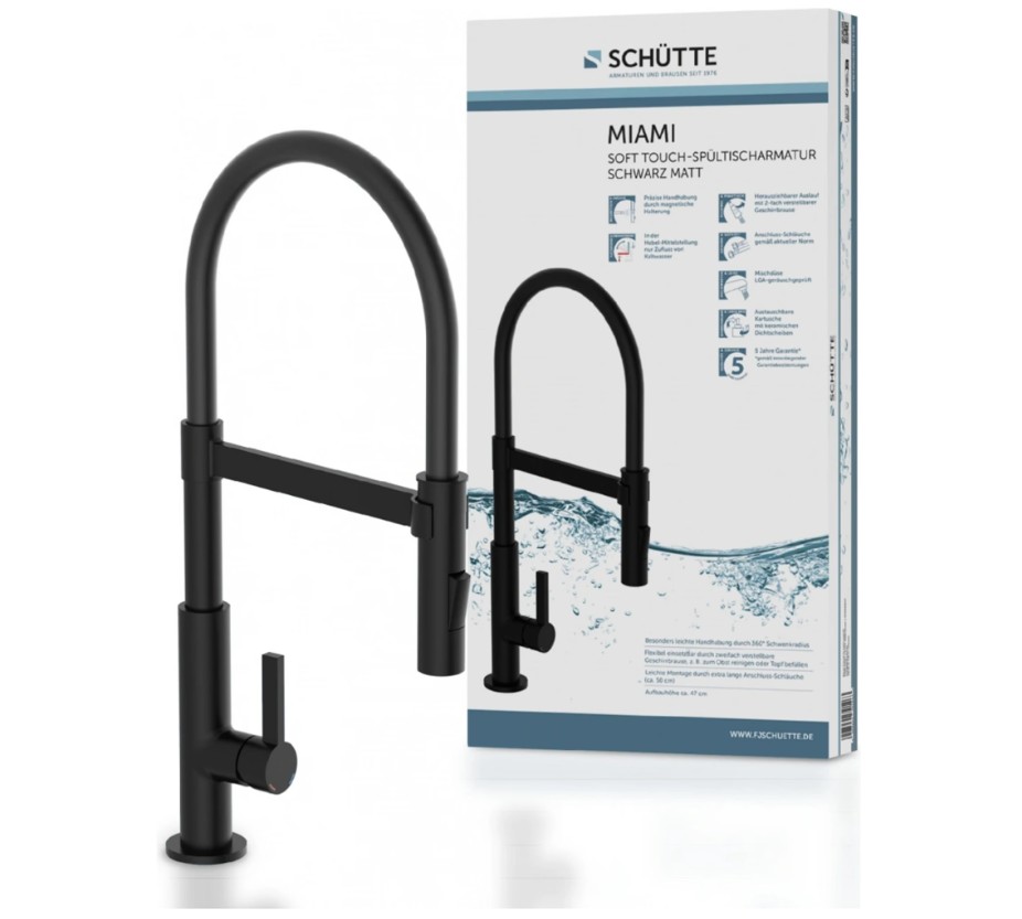 Designová dřezová baterie MIAMI v elegantním matně černém provedení se vyznačuje moderním vzhledem, praktickým provedením a vysokou funkčností. Díky flexibilní hadici soft touch nabízí maximální pohodlí při každodenním používání – ideální volba pro moderní kuchyně, které spojují styl a praktičnost.