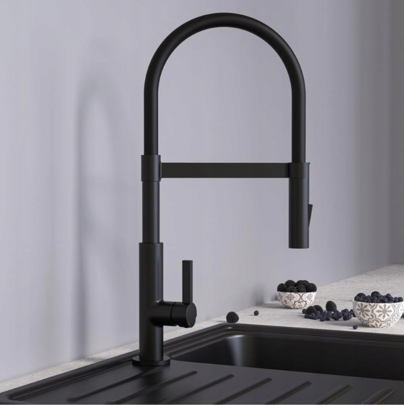 Dřezová baterie MIAMI v matně černém provedení s hadicí soft touch je dokonalým spojením designu, kvality a praktičnosti – ideální řešení pro každou moderní kuchyň.