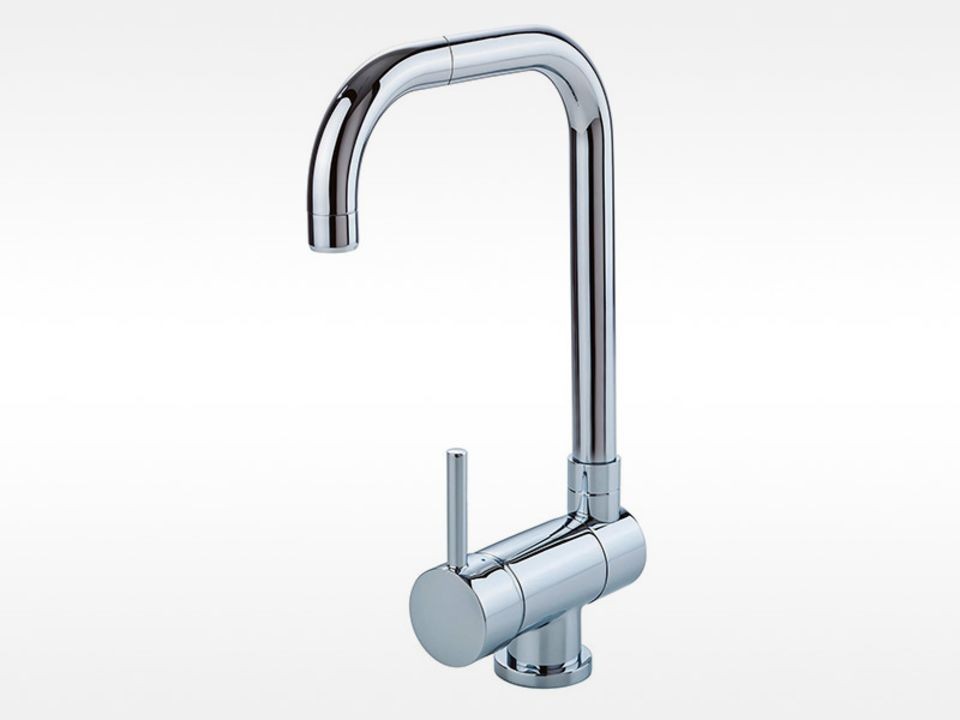 Elegantní, vysoce lesklá pochromovaná kuchyňská baterie s vysokým sklopným výtokem.