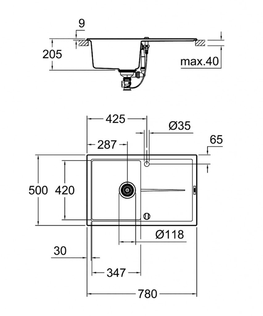 - velikost sektoru dřezu: 347 x 440 x 205 mm