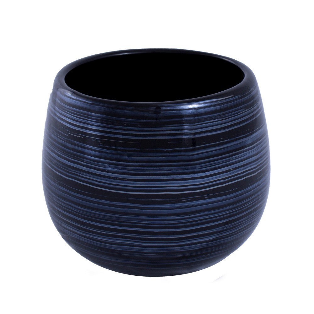 Elegantní a stylový hrnek ze série ABISSO. Na černém plášti jsou vodorovné, nepravidelné šedé kruhy.