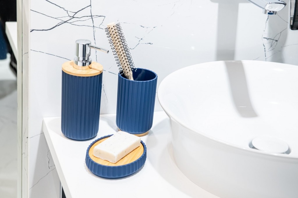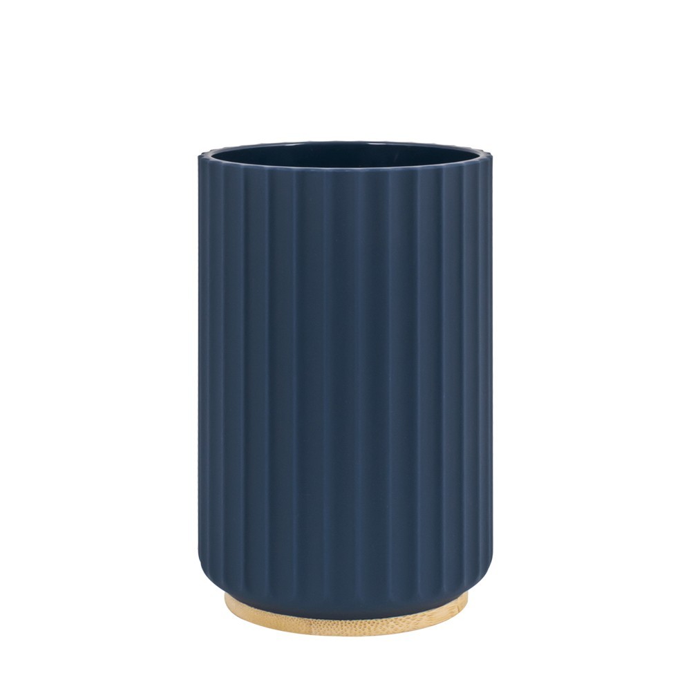 Elegantní koupelnový hrnek ze série Andora. Vyrobeno z materiálu příjemného na dotek v tmavě modré barvě. Dekorativní prvky z pravého bambusu dodávají přirozené kouzlo. Praktický koupelnový hrnek poslouží k odkládání zubních kartáčků a zubní pasty, štětců na make-up nebo drobné kosmetiky.