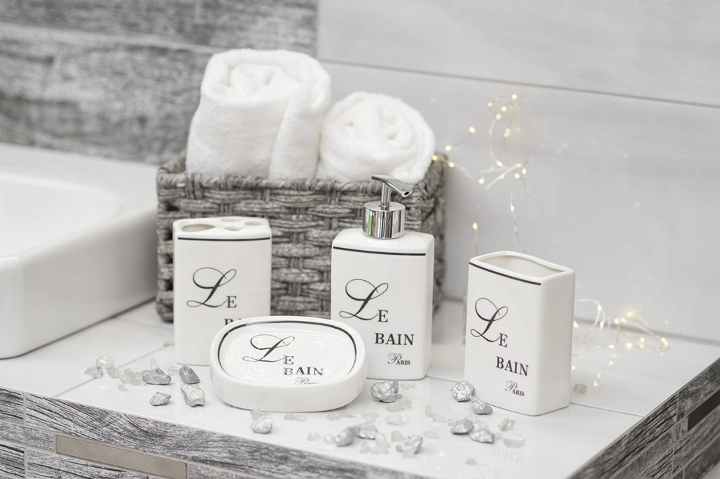 Kelímek na zubní kartáčky ze série PAULO, bílý s černými nápisy. Byl vyroben z porcelánu.