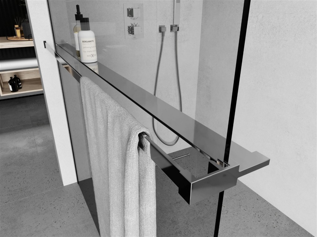 Praktickým doplňkem ke sprchovým zástěnám je originální držák na ručníky s poličkou na odkládání kosmetických přípravků. Hliníkovou polici je možné umístit do, vámi libovolně zvolené výšky, což uvítáte, pokud máte doma děti.