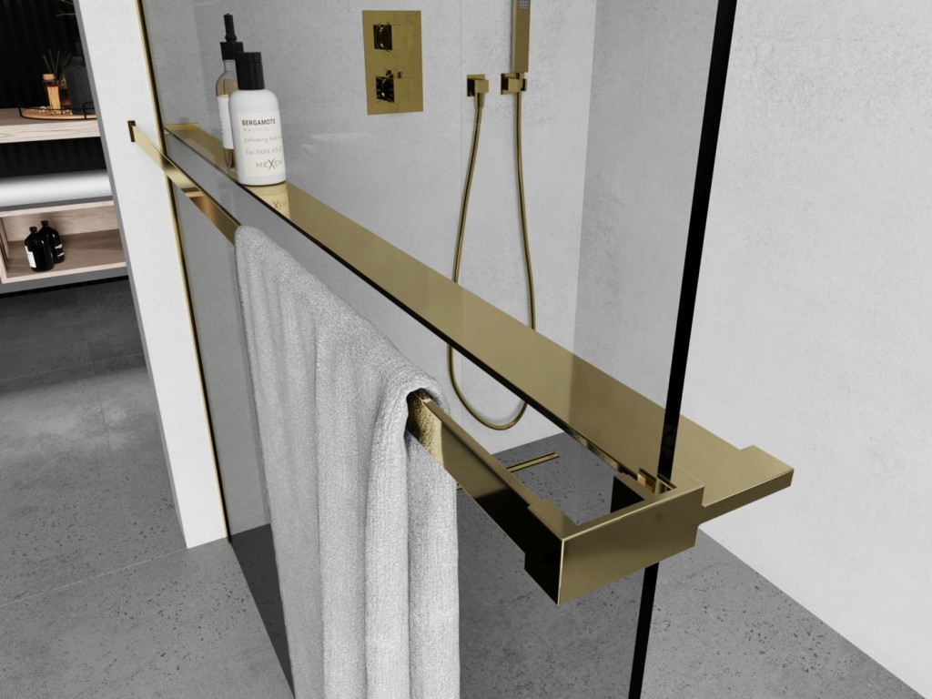 Praktickým doplňkem ke sprchovým zástěnám je originální držák na ručníky s poličkou na odkládání kosmetických přípravků. Hliníkovou polici je možné umístit do, vámi libovolně zvolené výšky, což uvítáte, pokud máte doma děti.
