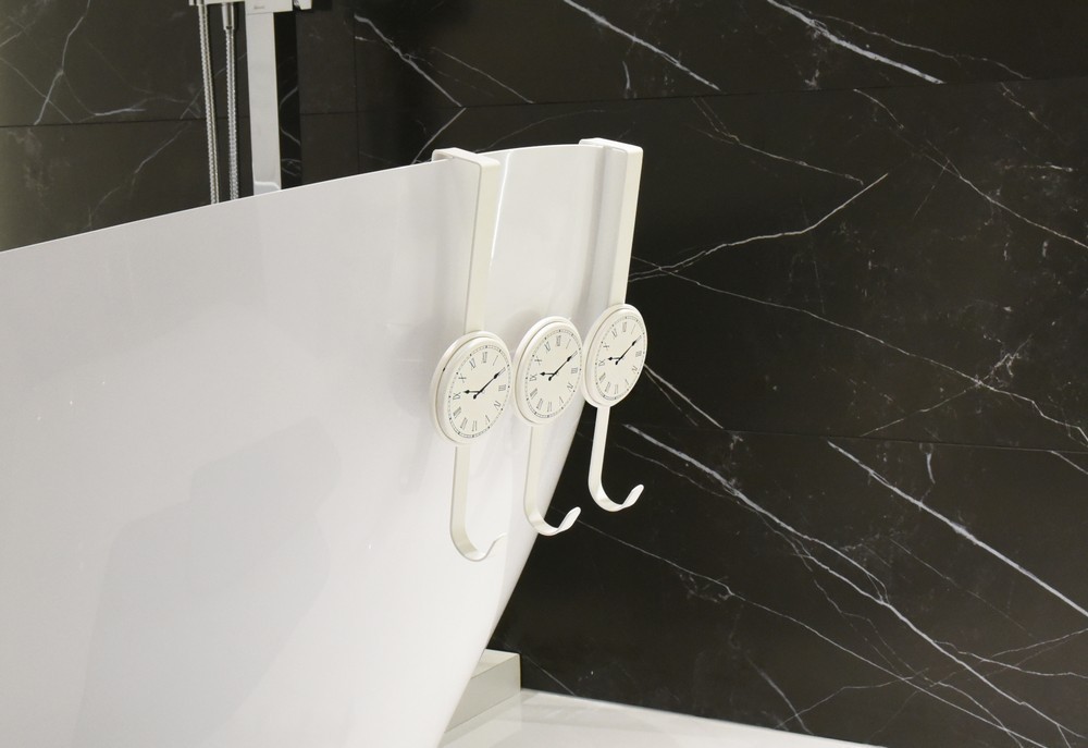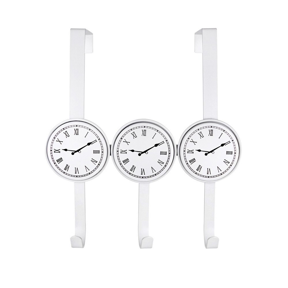 Bílý věšák na dveře do koupelny v rustikálním stylu se vzorem hodin.