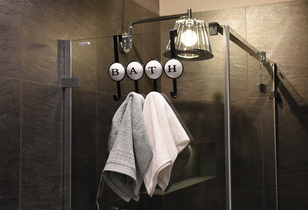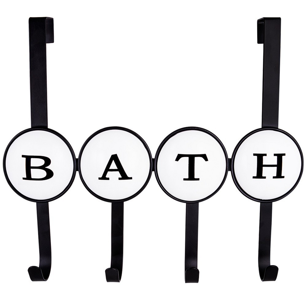 Věšák na koupelnové dveře v retro stylu v černé a bílé barvě s nápisem BATH. Vnese do koupelny velmi originální akcent.