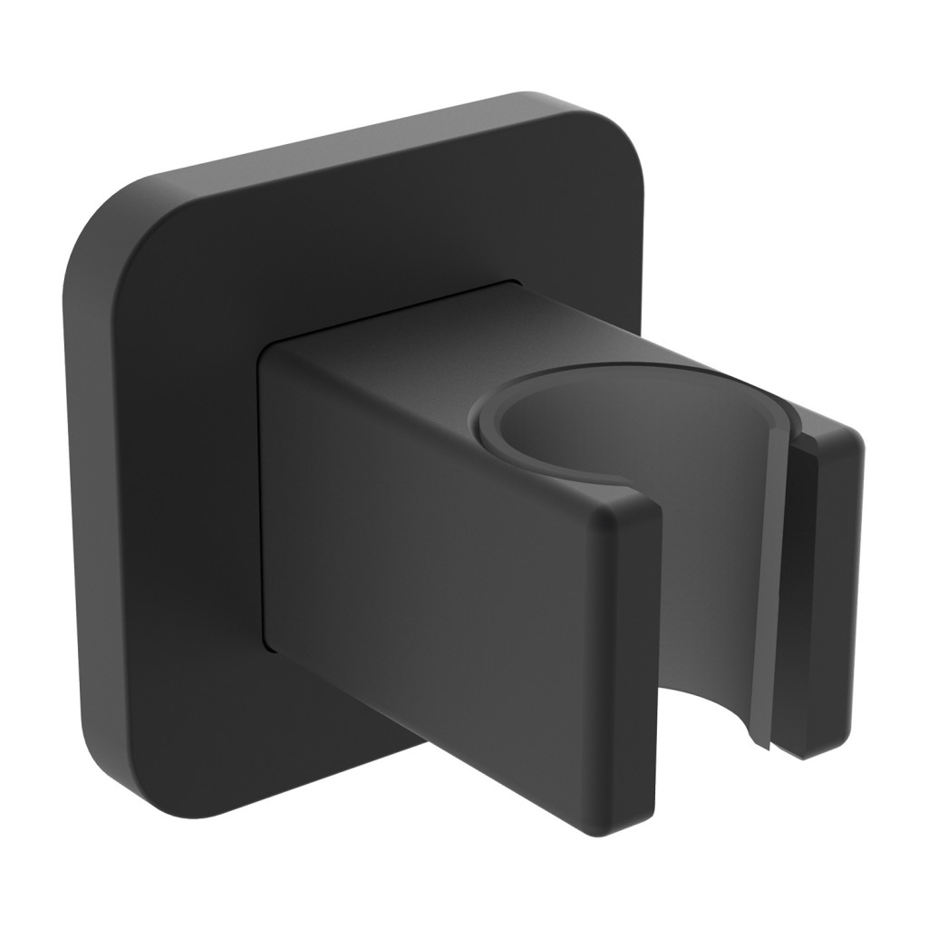 Nástěnný mosazný držák ruční sprchy hranatého tvaru s ochrannou vložkou.