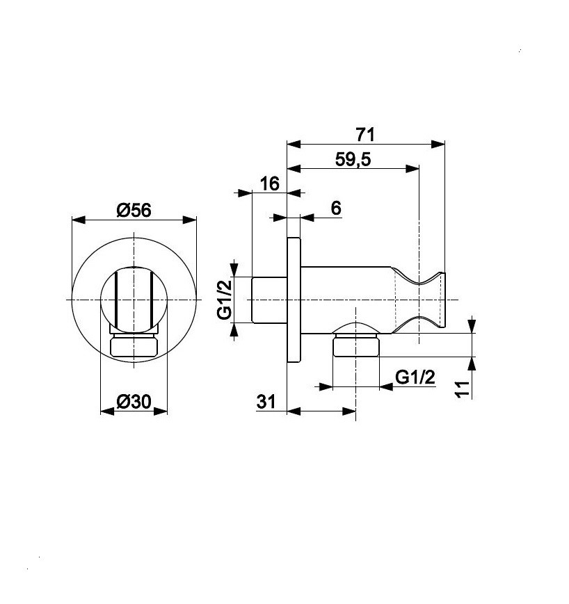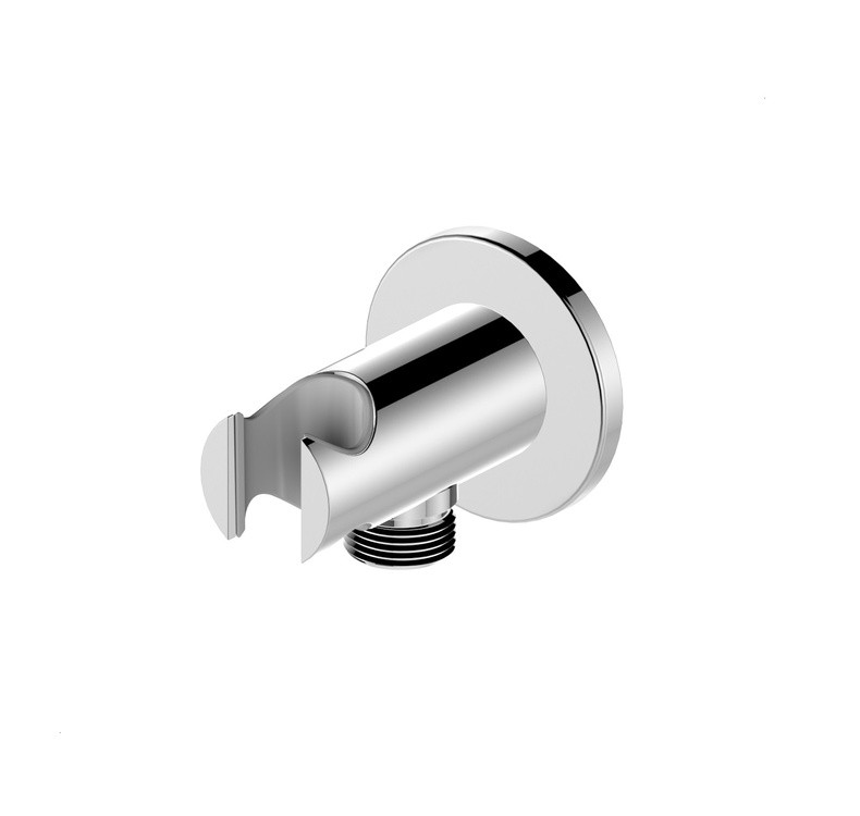 Podomítkový držák ruční sprchy série MOZA s vyústěním kulatého tvaru, vyrobený z mosazi. Dostupný je ve třech barevných provedení: chrom, broušené zlato a černá.