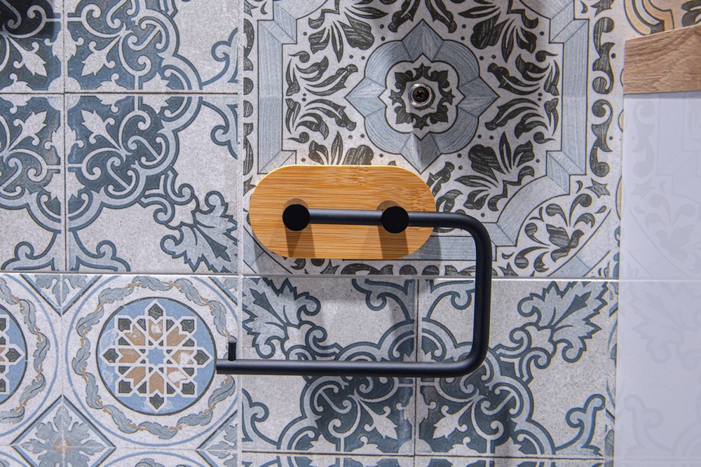 Držák toaletního papíru z kvalitní, černě lakované, oceli v kombinaci s populárním bambusem. Největší výhodou tohoto věšáku je jednoduché lepení na obklady pomocí velice silné 3M pásky. Samolepící koupelnové doplňky jsou ideálním řešením, pokud nechcete vrtat do obkladů. Velmi kvalitní lepící páska 3M přilne k různým povrchům a umožňuje snadné odstranění doplňků bez zanechání stop či poškození. Jeho maximální nosnost je 1 kg.