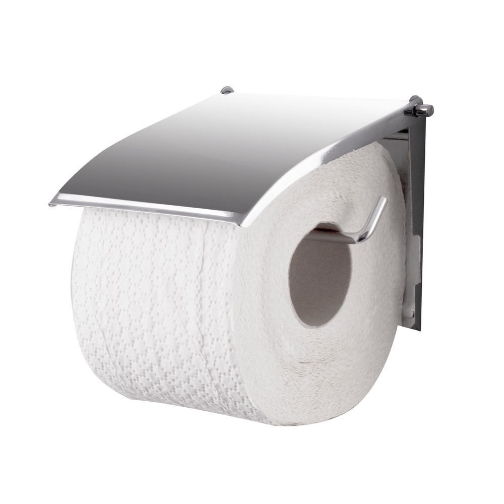 Držák toaletního papíru s klopou z chromované oceli. Sada obsahuje montážní prvky (montáž na stěnu pomocí šroubů a hmoždinek).