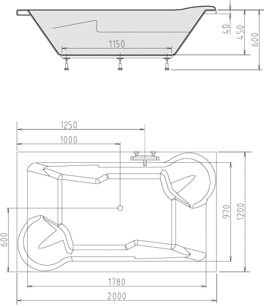 Vana s pohodlně tvarovanými stěnami pro opření zad na obou stranách a odtokem umístěným uprostřed.