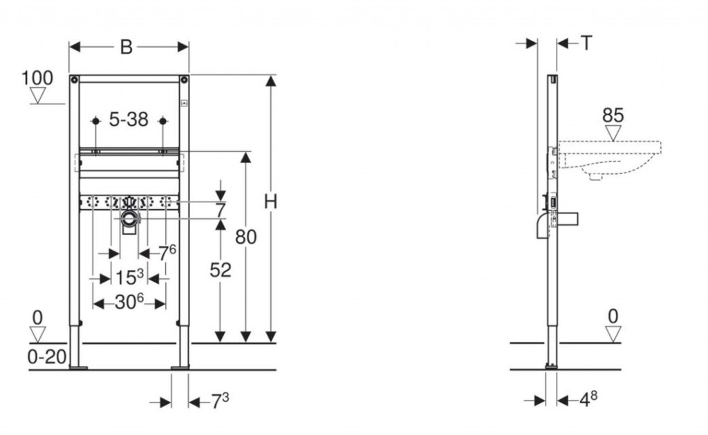 - Hloubka patní desky vhodná k montáži do U profilů UW 50 a UW 75 a do systémových profilů Geberit Duofix