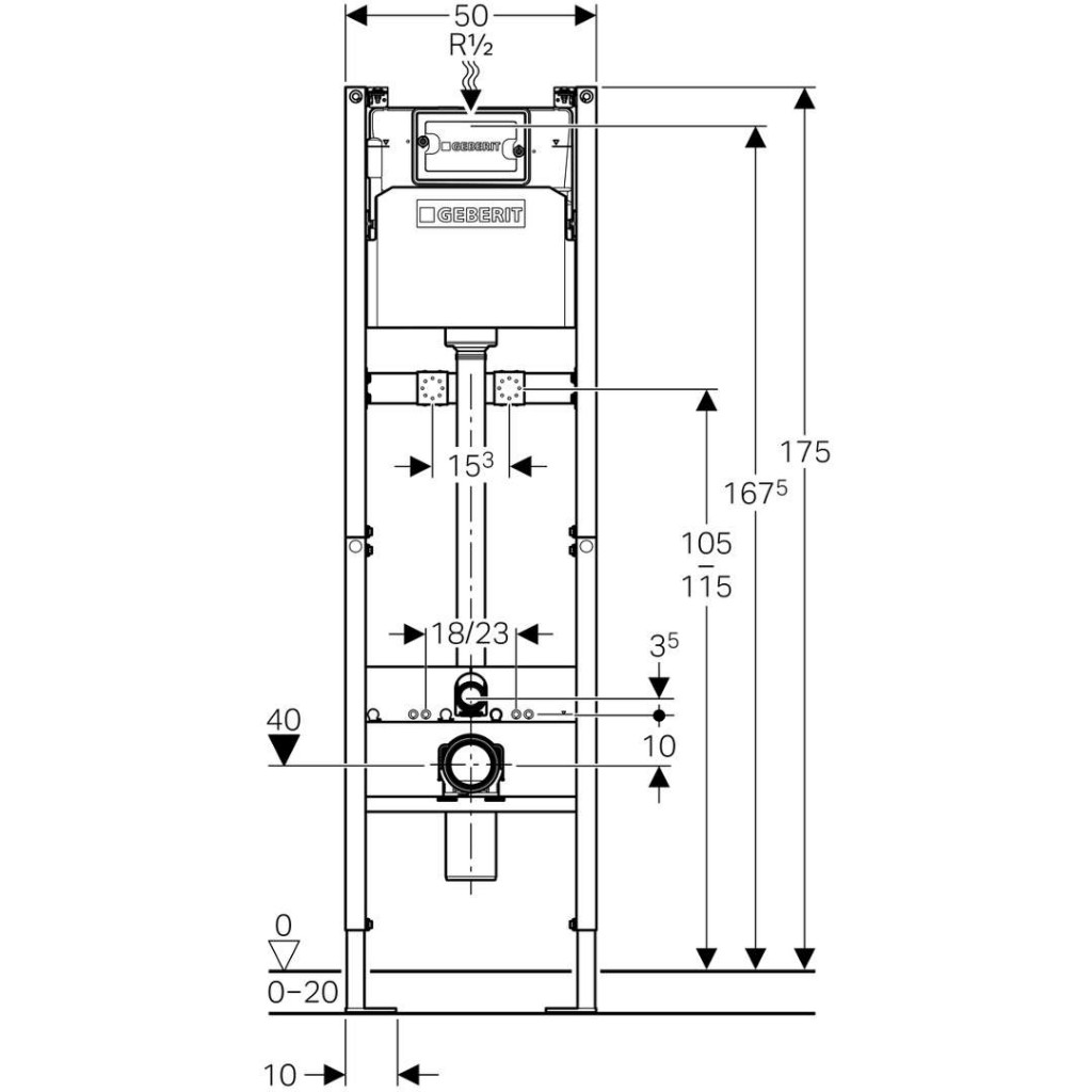 - rám s umisťovacími otvory pro soupravu pro ukotvení do stěny Geberit Duofix pro instalační prvky s nahoře otevřeným rámem