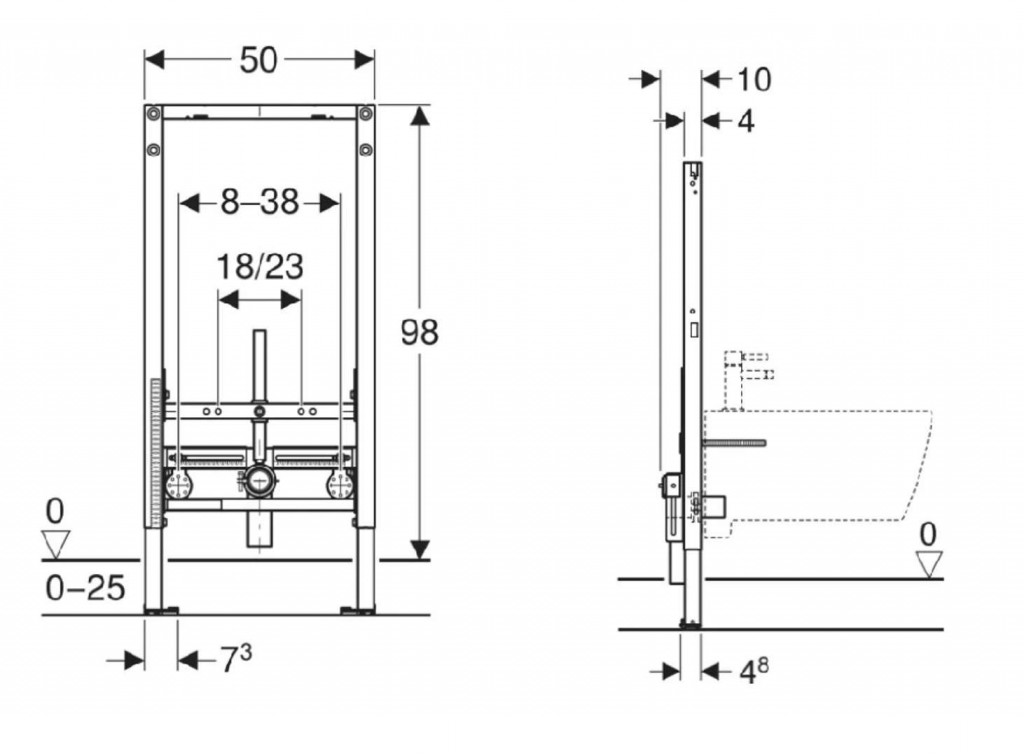 - Rozteč upevnění závěsného bidetu 18 nebo 23 cm