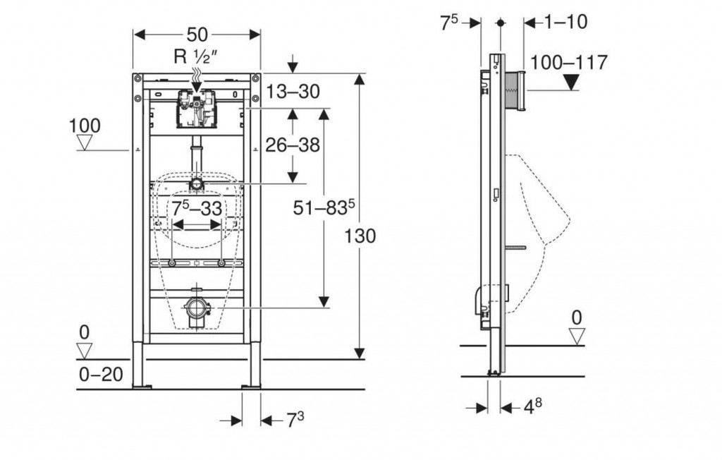 Montážní prvek Geberit Duofix pro pisoár, 130 cm, univerzální, s ovládáním splachování pisoáru Basic