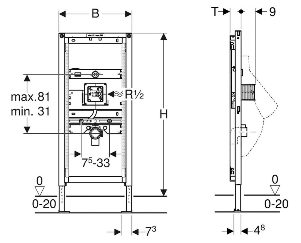 - Hloubka patní desky vhodná k montáži do U profilů UW 50 a UW 75 a do systémových profilů Geberit Duofix