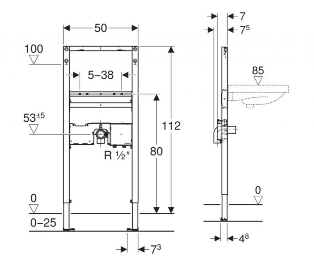 - Rozteč upevnění umyvadla: 5 – 38 cm