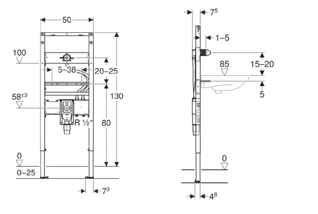 - Hloubka patní desky vhodná k montáži do U profilů UW 50 a UW 75 a do systémových profilů Geberit Duofix