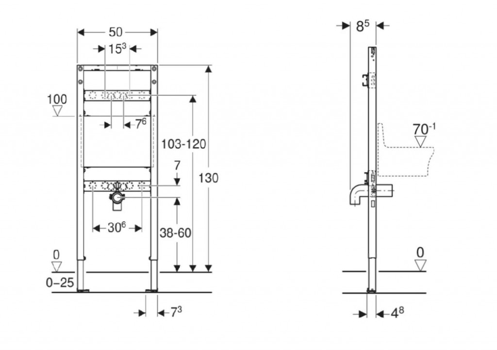 - Hloubka patní desky vhodná k montáži do U profilů UW 50 a UW 75 a do systémových profilů Geberit Duofix