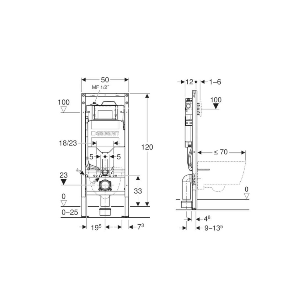 - Rám pro závěsná WC s připojovacími rozměry dle EN 33 a vyložením až 70 cm