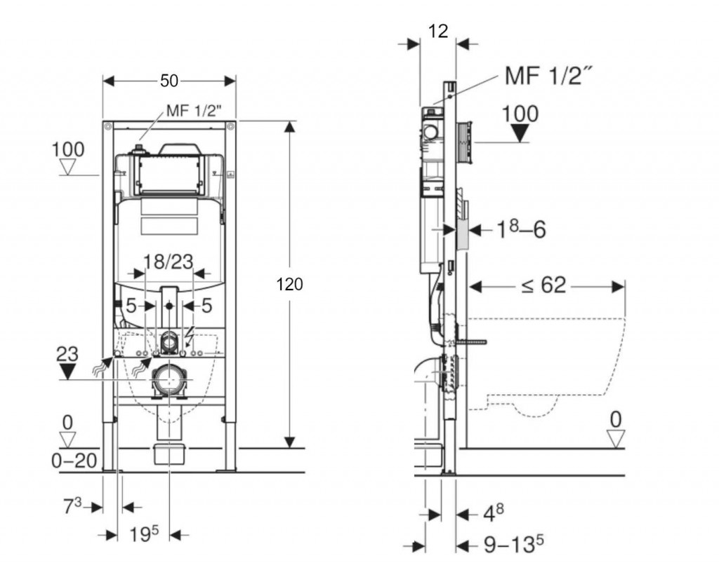 Montážní prvek Geberit Duofix pro závěsné WC, 120 cm, se splachovací nádržkou pod omítku Sigma 12 cm, s hygienickým proplachem HS30