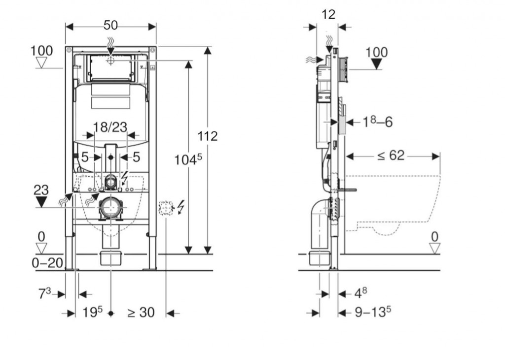 - k montáži do systémových stěn Geberit Duofix částečně vysokých nebo vysokých na výšku místnosti