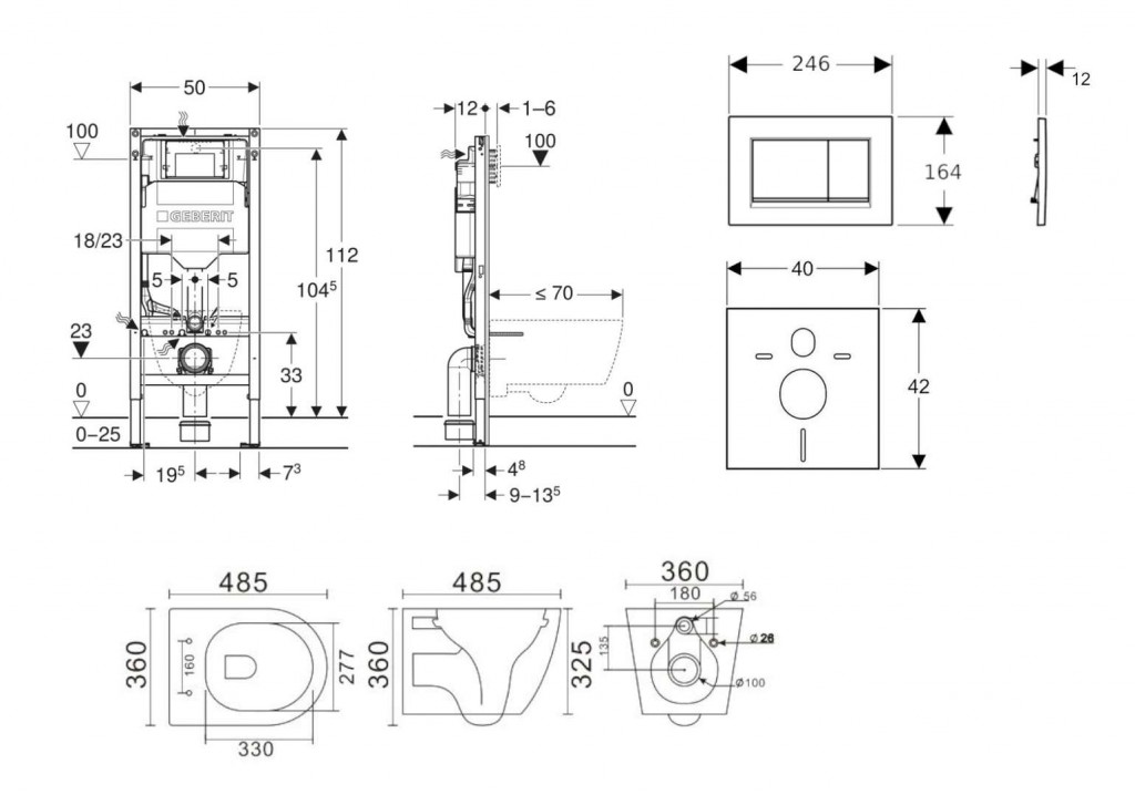 - k montáži do systémových stěn Geberit Duofix částečně vysokých nebo vysokých na výšku místnosti