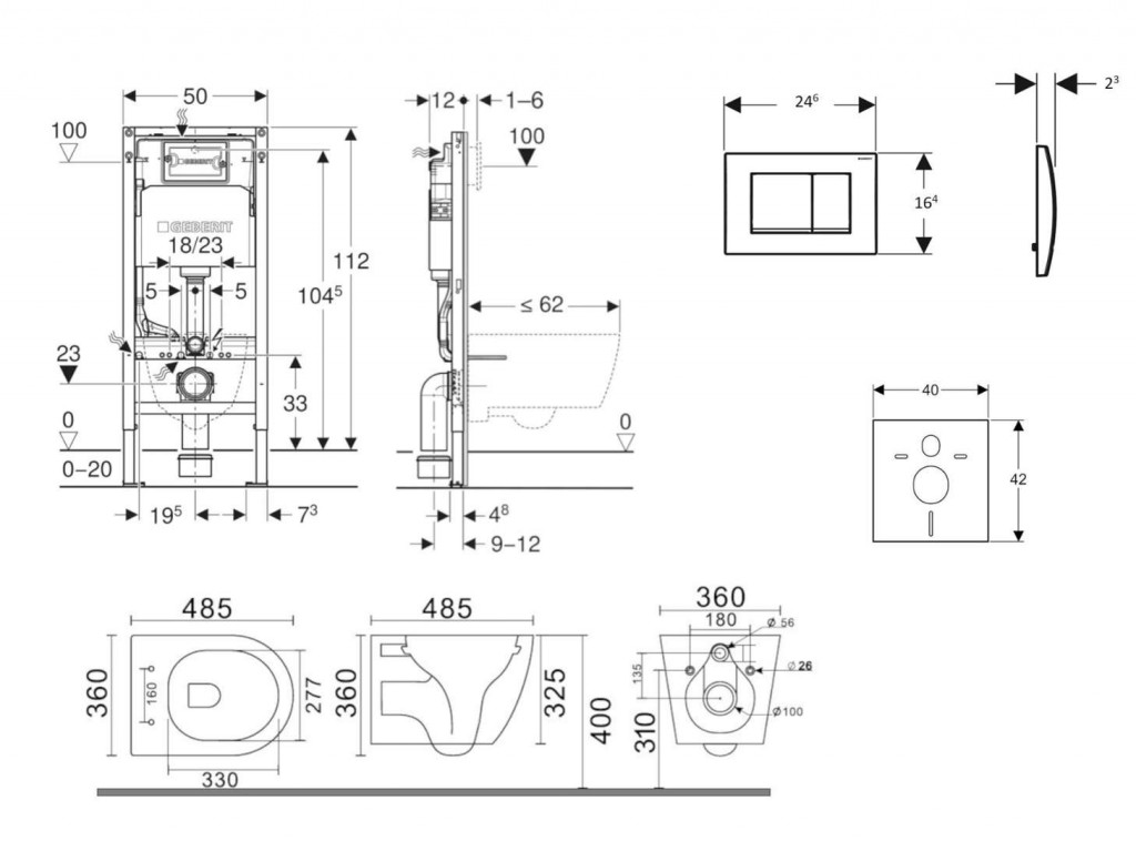 - rám pro nástěnné WC s připojovacími rozměry dle EN 33 a přesahem do 62 cm